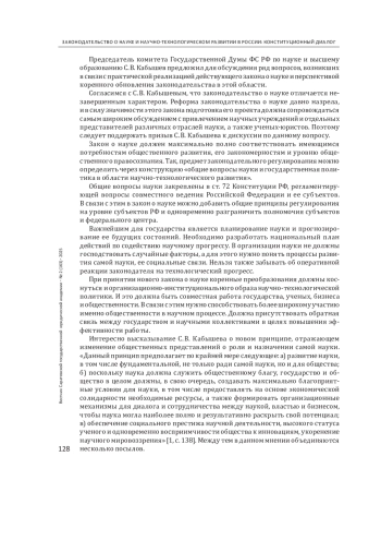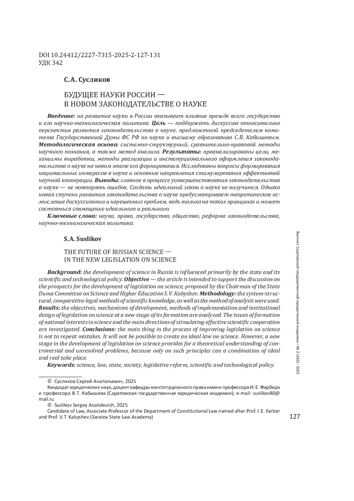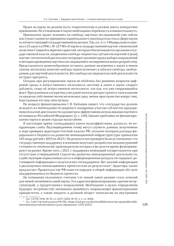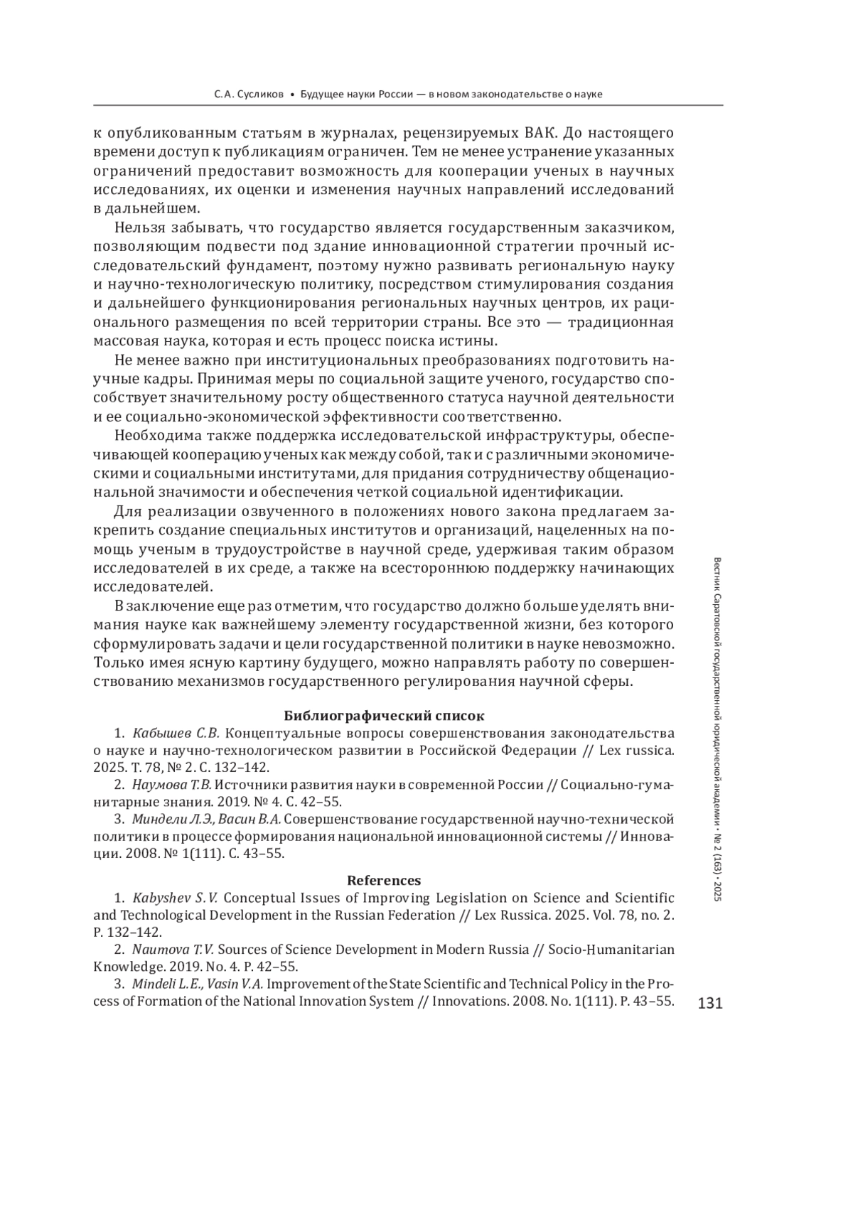 1. Кабышев С. В. Концептуальные вопросы совершенствования законодательства о науке и научно-технологическом развитии в Российской Федерации // Lex russica. 2025. Т. 78, № 2. С. 132-142.