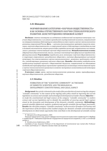 Введение: статья посвящена исследованию особенностей построения категории «научная общественность» в условиях проводимой государственной политики, направленной на совершенствование действующего законодательства о науке и научно-технологическом развитии современной России. Цель - изучить конституционно-правовую сущность категории «научная общественность» в современной науке и действующем законодательстве и выявить возможность закрепления особых правовых режимов, направленных на становление и развитие отечественной научной общественности.