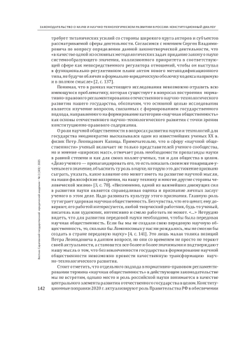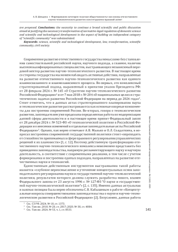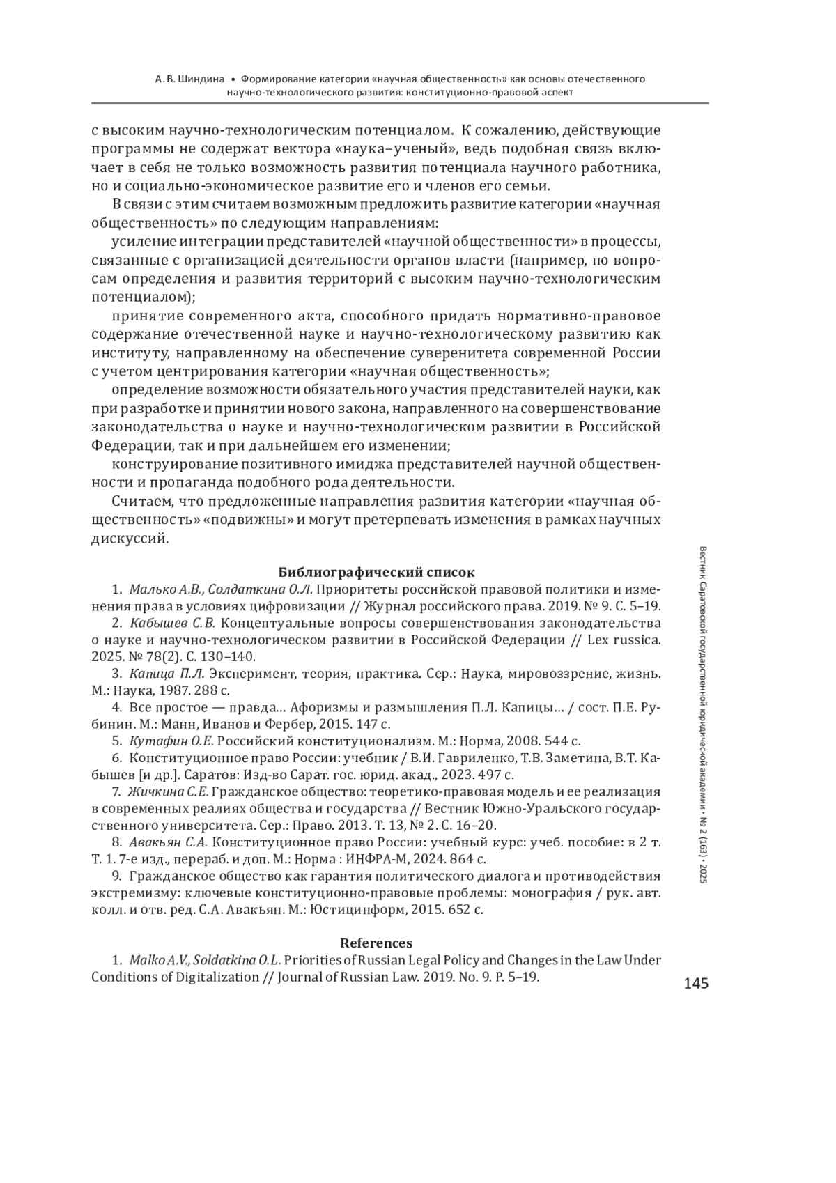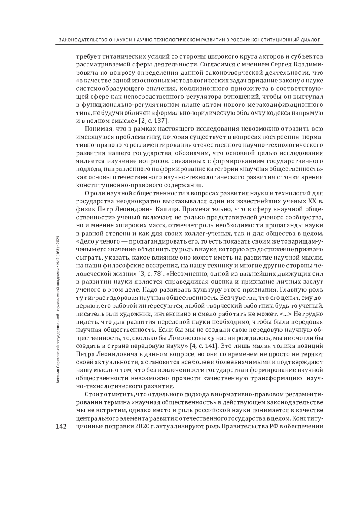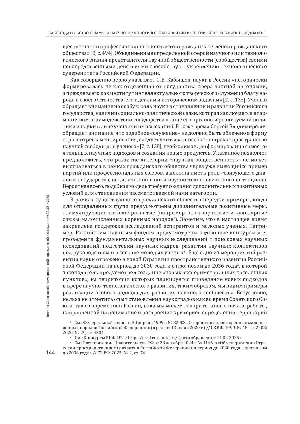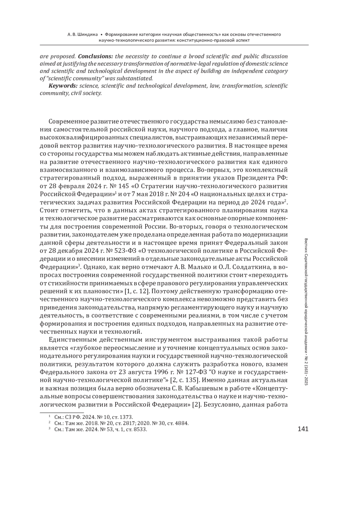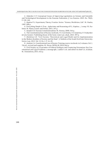2. Кабышев С. В. Концептуальные вопросы совершенствования законодательства о науке и научно-технологическом развитии в Российской Федерации // Lex russica. 2025. № 78(2). С. 130-140.