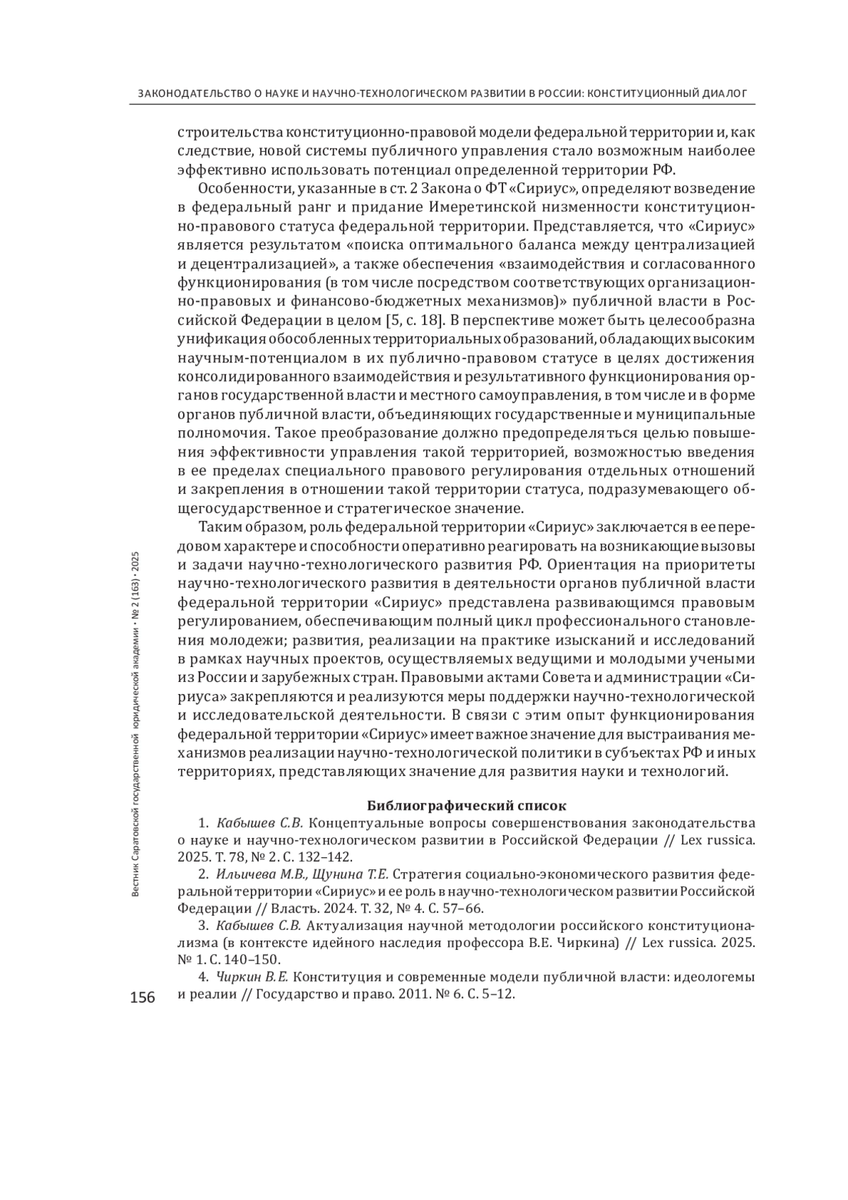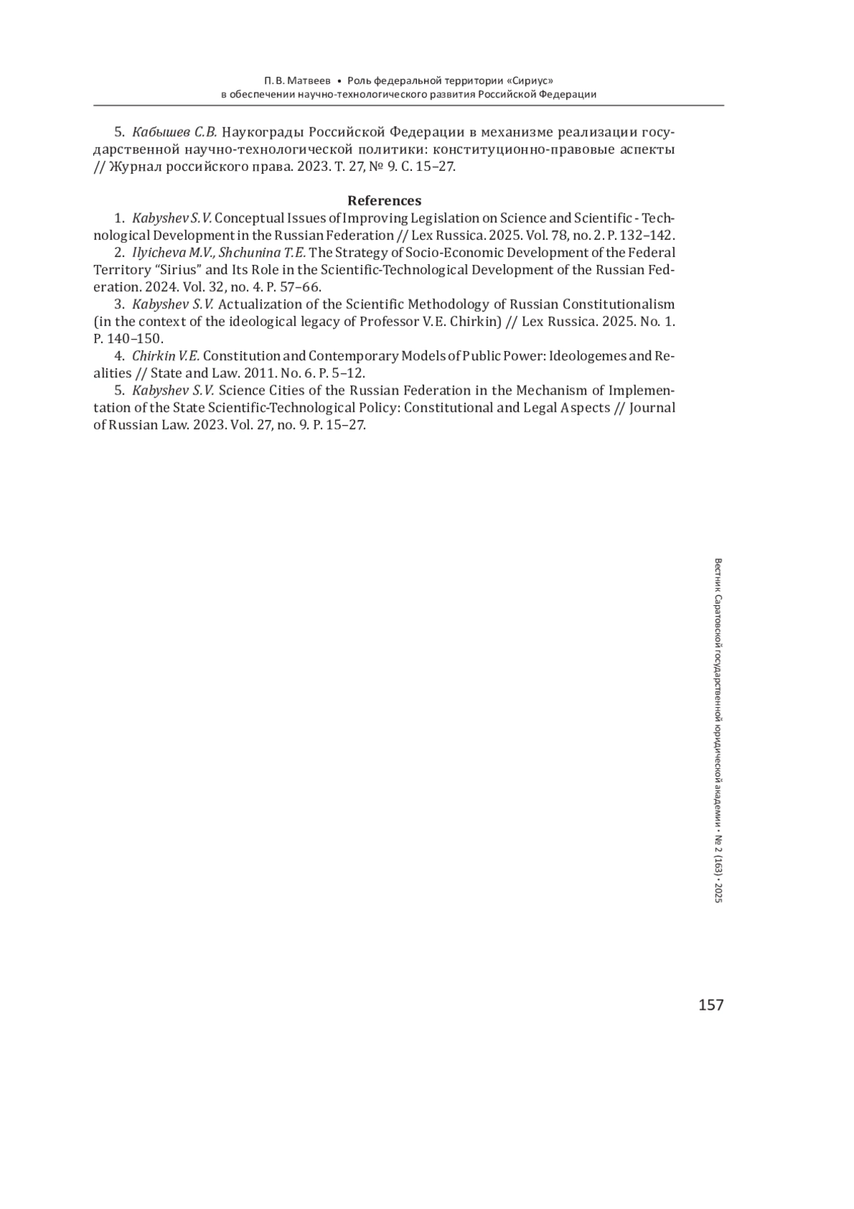 1. Кабышев С. В. Концептуальные вопросы совершенствования законодательства о науке и научно-технологическом развитии в Российской Федерации // Lex russica. 2025. Т. 78, № 2. С. 132-142. EDN: JRNQMI