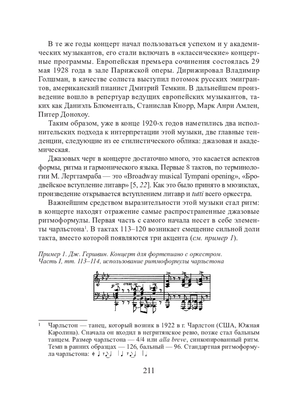 3 декабря 1925 года Джордж Гершвин впервые исполнил с НьюЙоркским филармоническим оркестром свой фортепианный концерт. Выступление прошло с большим успехом, но при этом было отмечено диаметрально противоположными отзывами критиков. С. П. Дягилев был краток: «Хороший джаз, но плохой Лист» [1, 48]. С. С. Прокофьев охарактеризовал это сочинение как «тридцатидвух тактовые припевы, бездарно соединенные между собой» [1, 48]. Лоуренс Гилман из Herald — Tribune писал, что Гершвин создал нечто «традиционное и банальное» [6, 352]. Музыкальный критик Сэмюэл Хоцинов (Samuel Chotzinoff) в газете New York World, напротив, отзывался положительно о концерте, называя Гершвина «гением, и, пожалуй, единственным из всех молодых людей, который старается по-настоящему выразить дух времени» [перевод здесь и далее мой. — Н. К.] [7, 14]. Газета The Courier упоминала концерт как «произведение, которому есть что сказать, хотя местами это звучит довольно грубо» [6, 352]. New Yorker пошла еще дальше, написав о том, что «фортепианный концерт Гершвина — самая важная работа, которая прозвучала в этой деревушке» [6, 352].