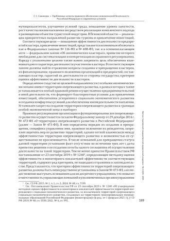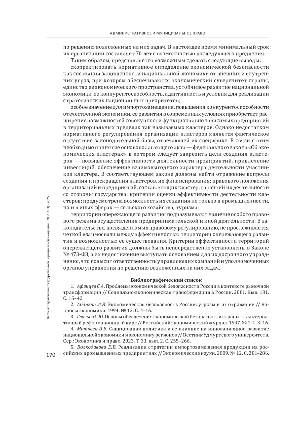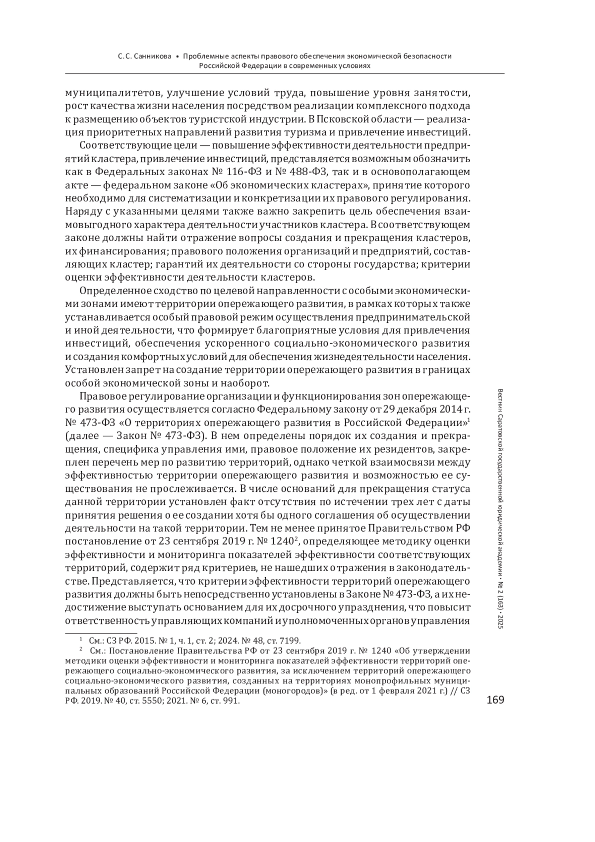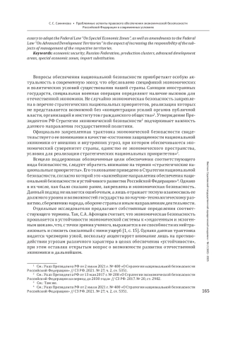 Результаты: выявлена необходимость корректировки нормативного определения термина «экономическая безопасность», предложены изменения в правовых актах по вопросам развития экономических кластеров и территорий опережающего развития.