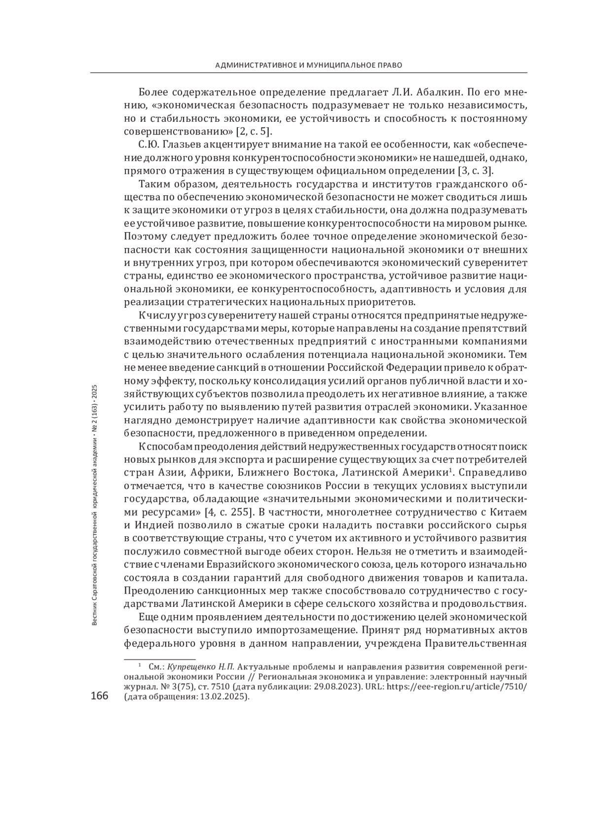 Вопросы обеспечения национальной безопасности приобретают особую актуальность в современную эпоху, что обусловлено спецификой экономических и политических условий существования нашей страны. Санкции иностранных государств, специальная военная операция определяют наличие вызовов для отечественной экономики. Не случайно экономическая безопасность закреплена в перечне стратегических национальных приоритетов, реализация которых не представляется возможной без «концентрации усилий органов публичной власти, организаций и институтов гражданского общества». Утверждение Президентом РФ Стратегии экономической безопасности подчеркивает важность данного направления государственной политики.