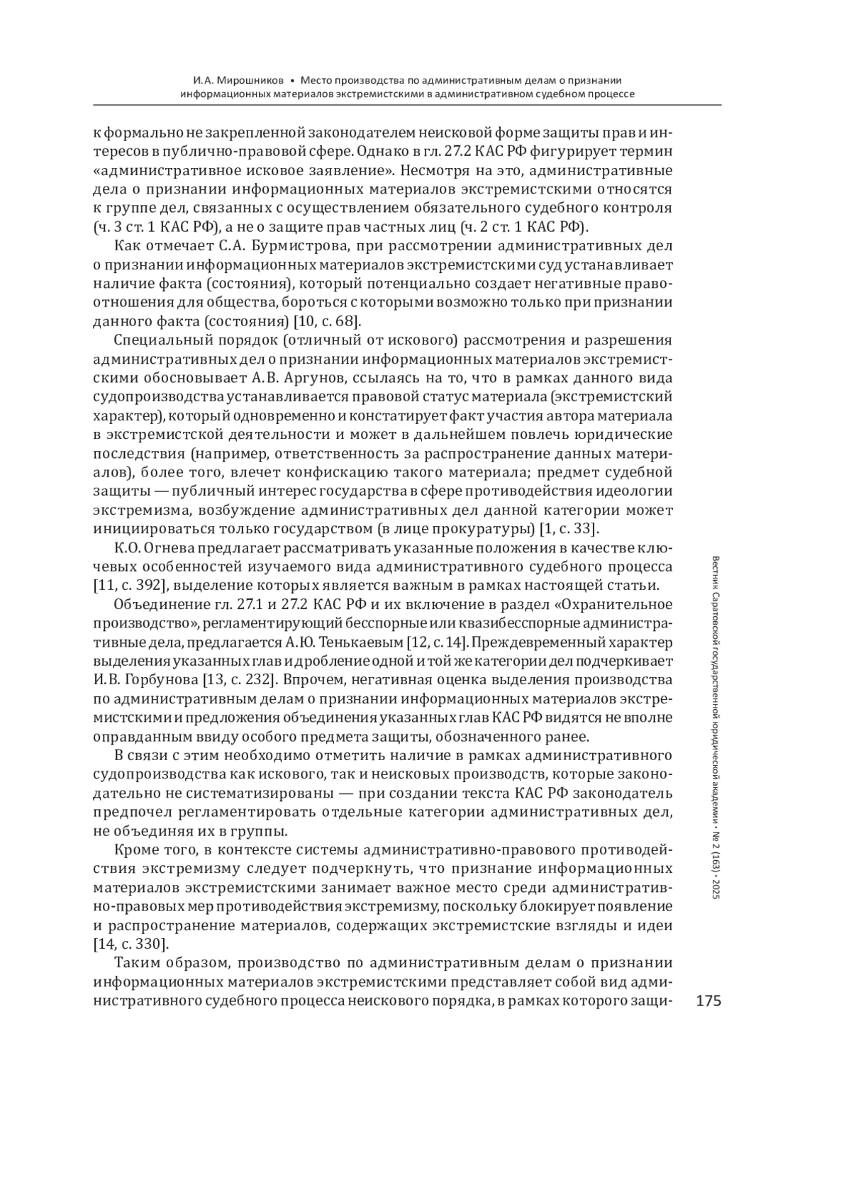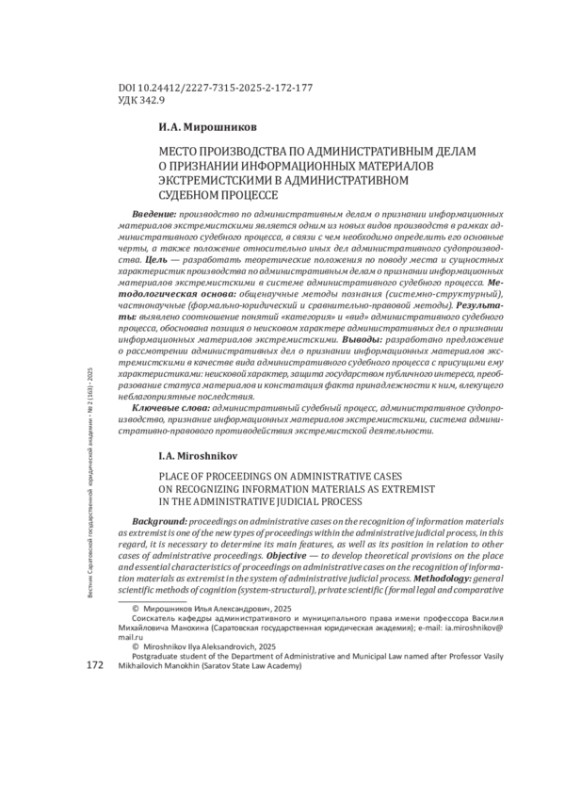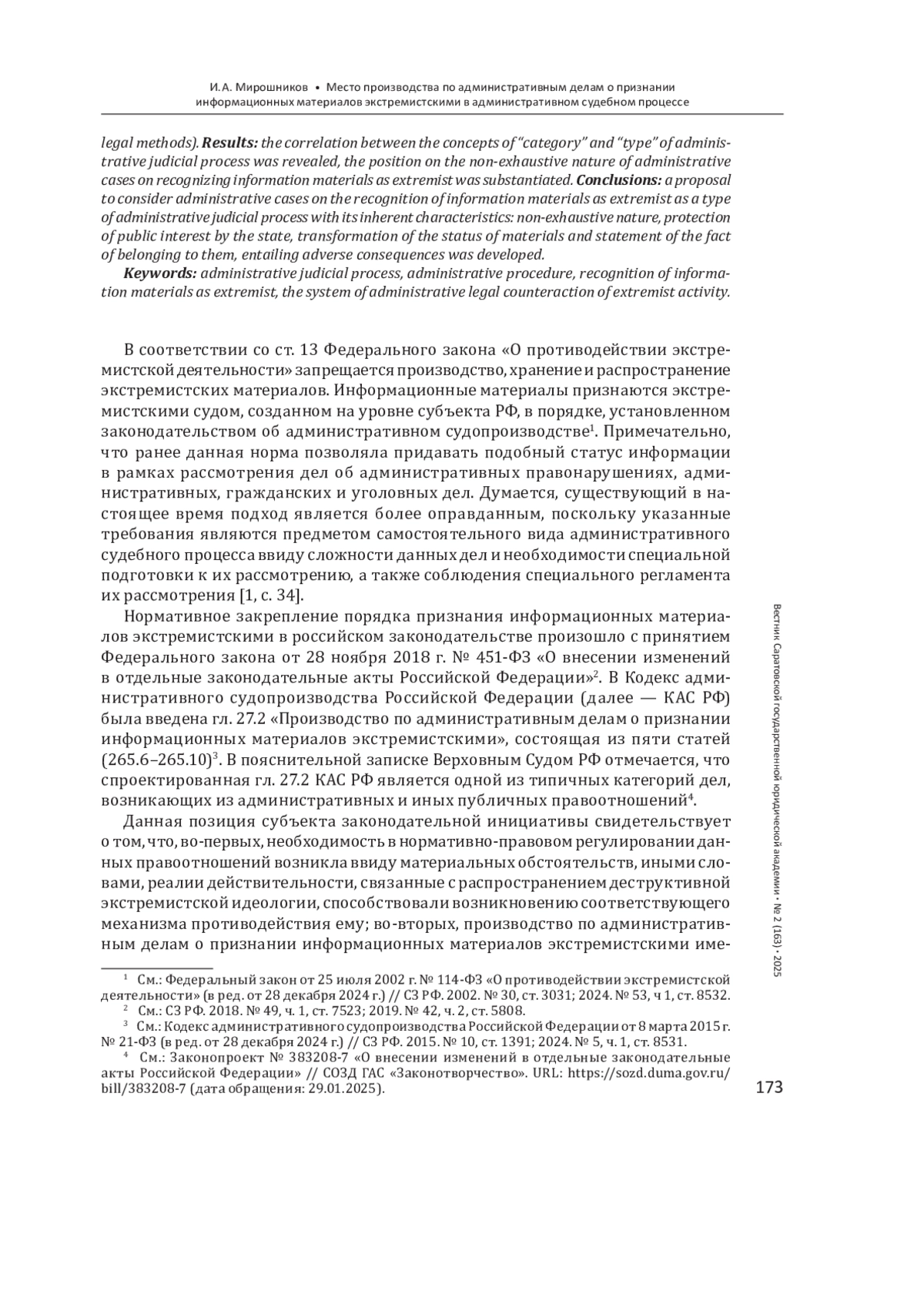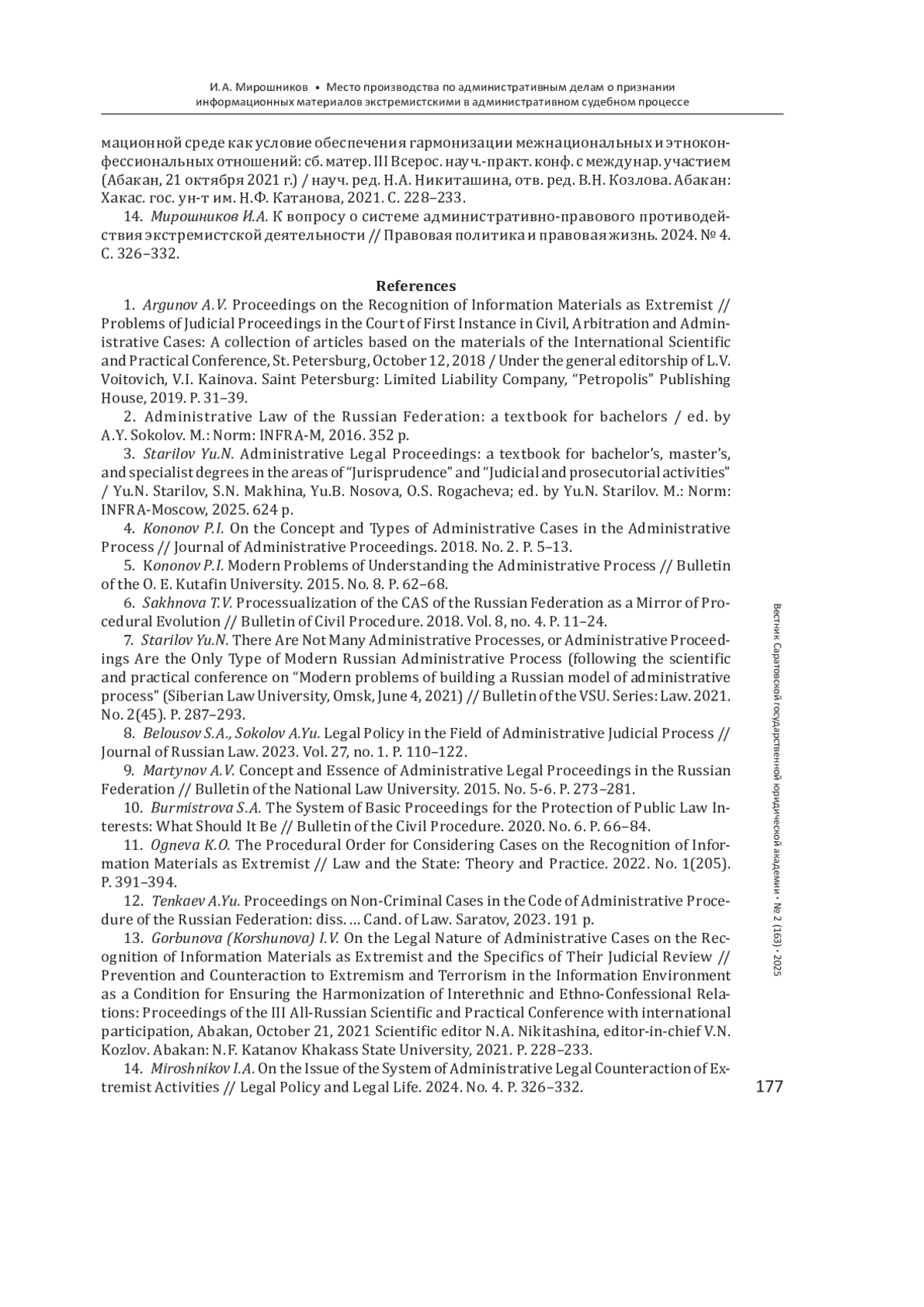 14. 	Мирошников И.А. К вопросу о системе административно-правового противодействия экстремистской деятельности // Правовая политика и правовая жизнь. 2024. № 4. С. 326-332. EDN: ERAEYV