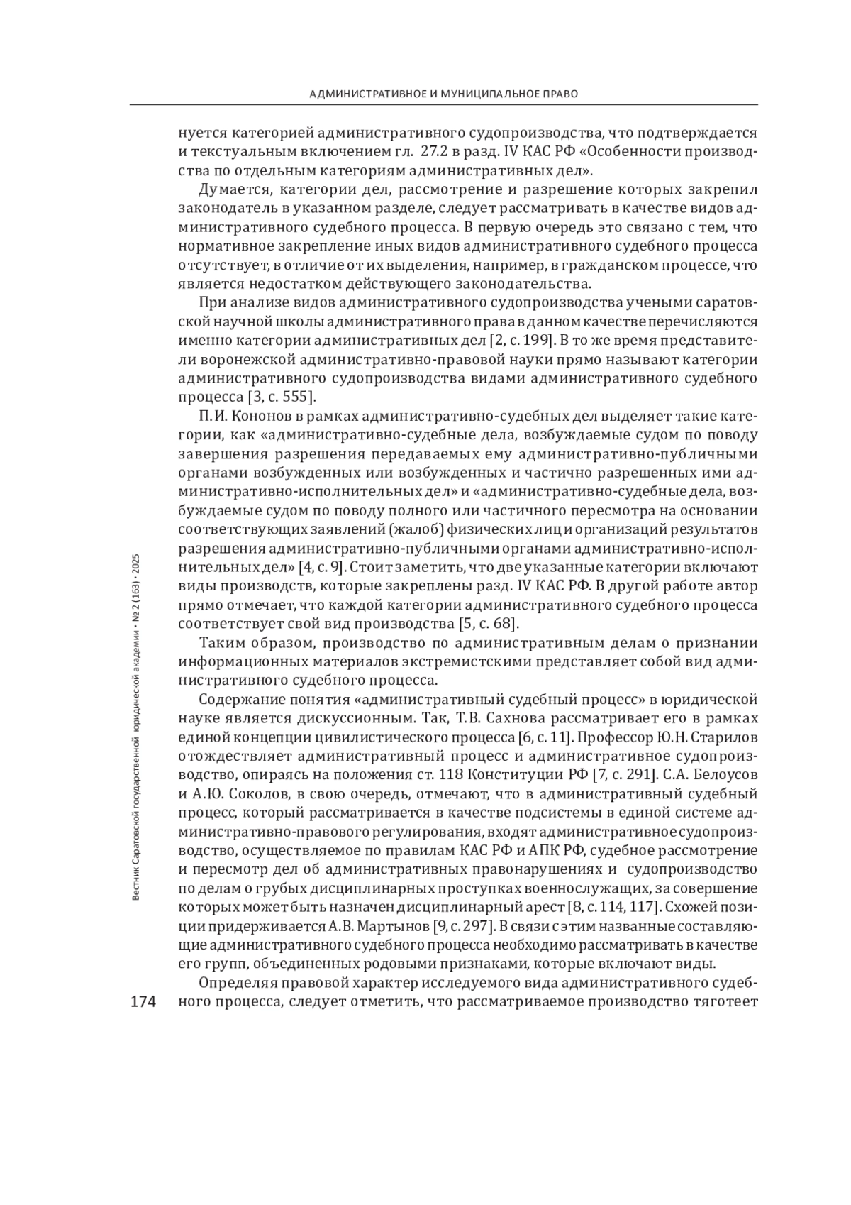 4. 	Кононов П.И. О понятии и видах административных дел в административном процессе // Журнал административного судопроизводства. 2018. № 2. С. 5-13. EDN: YGLCZN