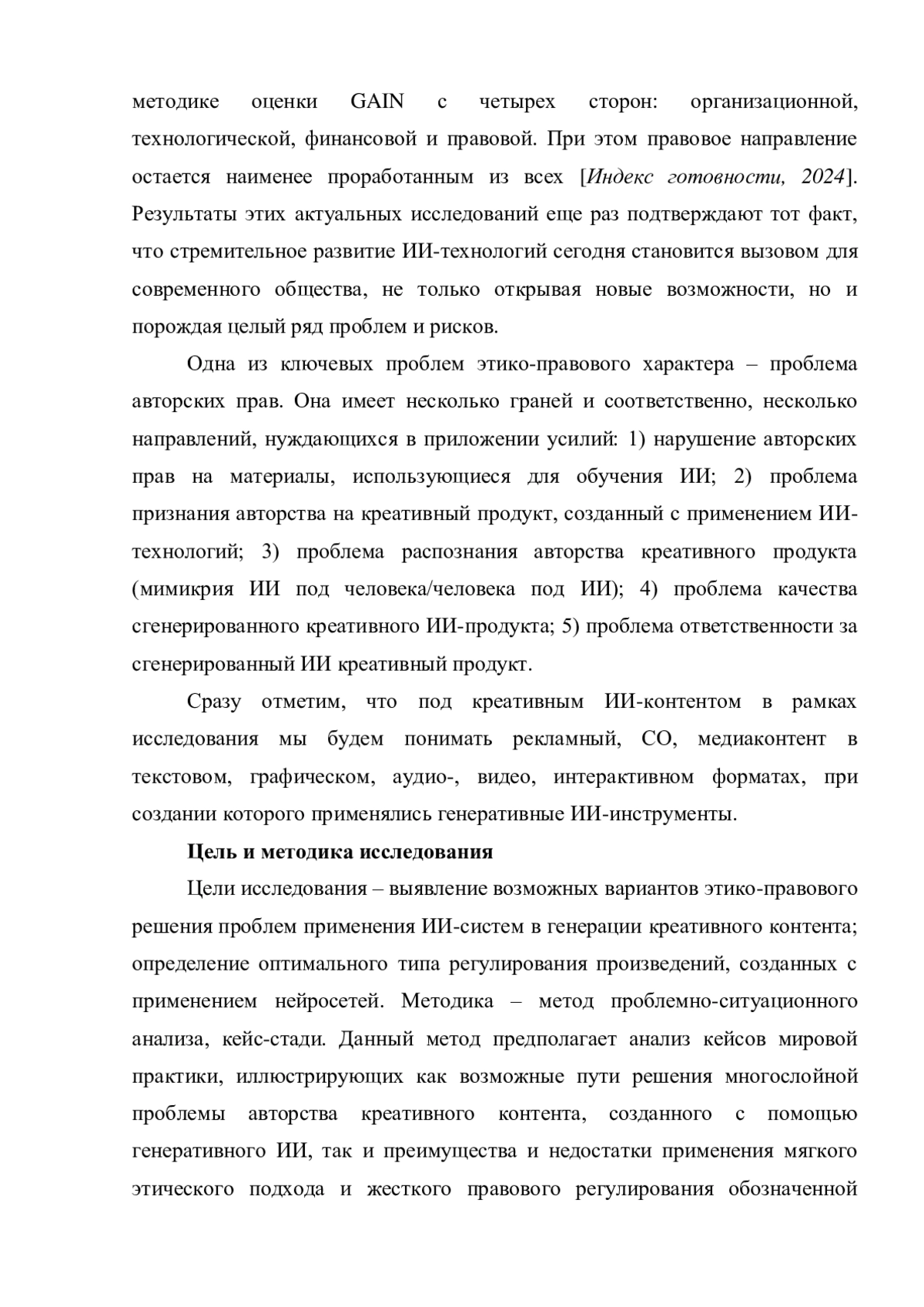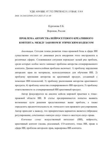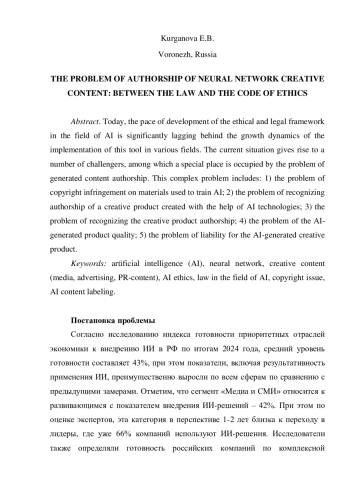 Сегодня темпы развития этико-правовой базы в сфере ИИ существенно отстают от динамики роста внедрения этого инструмента в различных сферах. Сложившаяся ситуация порождает целый ряд проблем, среди которых особое место занимает проблема авторства сгенерированного контента. Данная многослойная проблема включает: 1) проблему нарушения авторских прав на материалы, использующиеся для обучения ИИ; 2) проблему признания авторства на креативный продукт, созданный с помощью ИИ-технологий; 3) проблему распознания авторства креативного продукта; 4) проблему качества сгенерированного ИИ-продукта; 5) проблему ответственности за сгенерированный ИИ креативный продукт.