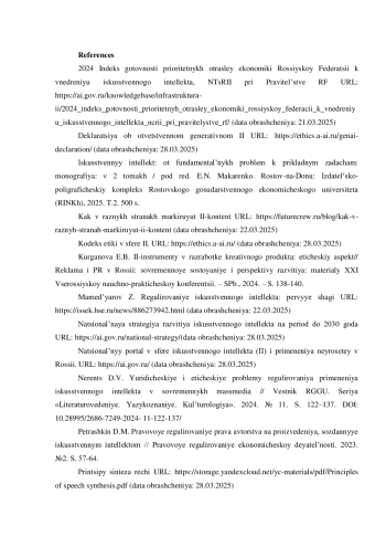 1. 2024 Индекс готовности приоритетных отраслей экономики Российской Федерации к внедрению искусственного интеллекта, НЦРИИ при Правительстве РФ URL: https://ai.gov.ru/knowledgebase/infrastruktura-ii/2024_indeks_gotovnosti_prioritetnyh_otrasley_ekonomiki_rossiyskoy_federacii_k_vnedreniyu_iskusstvennogo_intellekta_ncrii_pri_pravitelystve_rf/ (дата обращения: 21.03.2025).