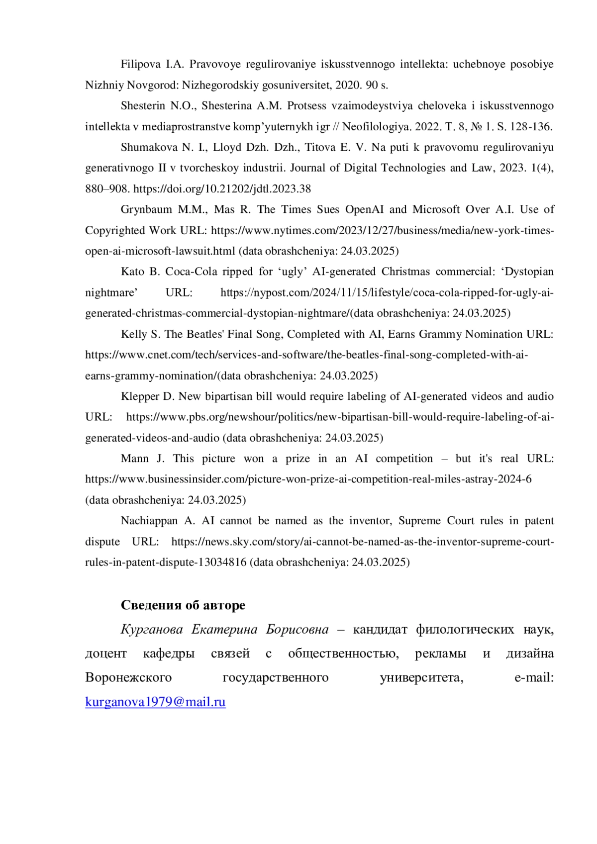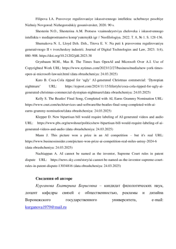 6. Курганова Е.Б. ИИ-инструменты в разработке креативного продукта: этический аспект// Реклама и PR в России: современное состояние и перспективы развития: материалы XXI Всероссийской научно-практической конференции. СПб., 2024. С. 138-140.