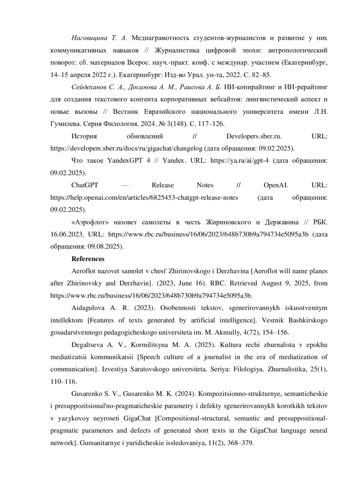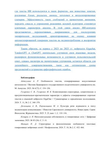 1. 	Айдагулова А. Р. Особенности текстов, сгенерированных искусственным интеллектом // Вестник Башкирского государственного педагогического университета им. М. Акмуллы. 2023. № 4(72). С. 154-156.