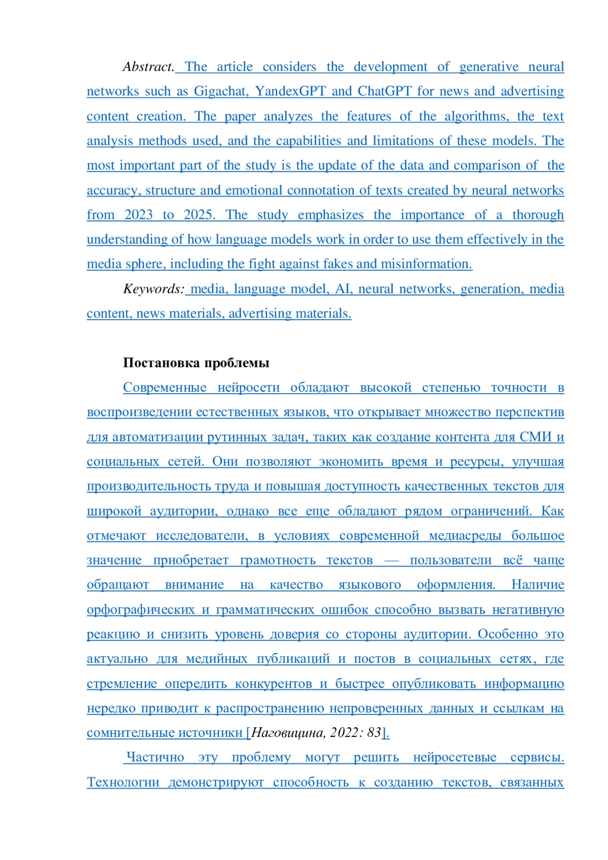 Современные нейросети обладают высокой степенью точности в воспроизведении естественных языков, что открывает множество перспектив для автоматизации рутинных задач, таких как создание контента для СМИ и социальных сетей. Они позволяют экономить время и ресурсы, улучшая производительность труда и повышая доступность качественных текстов для широкой аудитории, однако все еще обладают рядом ограничений. Как отмечают исследователи, в условиях современной медиасреды большое значение приобретает грамотность текстов — пользователи всё чаще обращают внимание на качество языкового оформления. Наличие орфографических и грамматических ошибок способно вызвать негативную реакцию и снизить уровень доверия со стороны аудитории. Особенно это актуально для медийных публикаций и постов в социальных сетях, где стремление опередить конкурентов и быстрее опубликовать информацию нередко приводит к распространению непроверенных данных и ссылкам на сомнительные источники [Наговицина, 2022: 83].