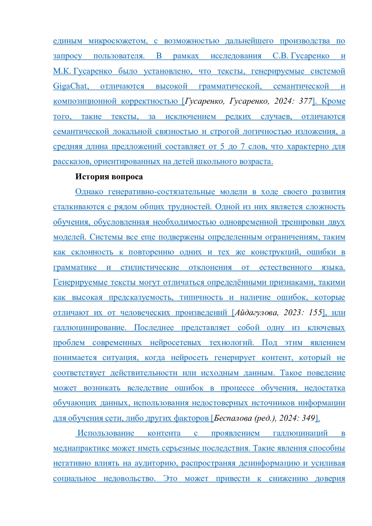 2. 	Гусаренко С. В., Гусаренко М. К. Композиционно-структурные, семантические и пресуппозиционально-прагматические параметры и дефекты сгенерированных коротких текстов в языковой нейросети GigaChat // Гуманитарные и юридические исследования. 2024. Т. 11, № 2. С. 368-379.