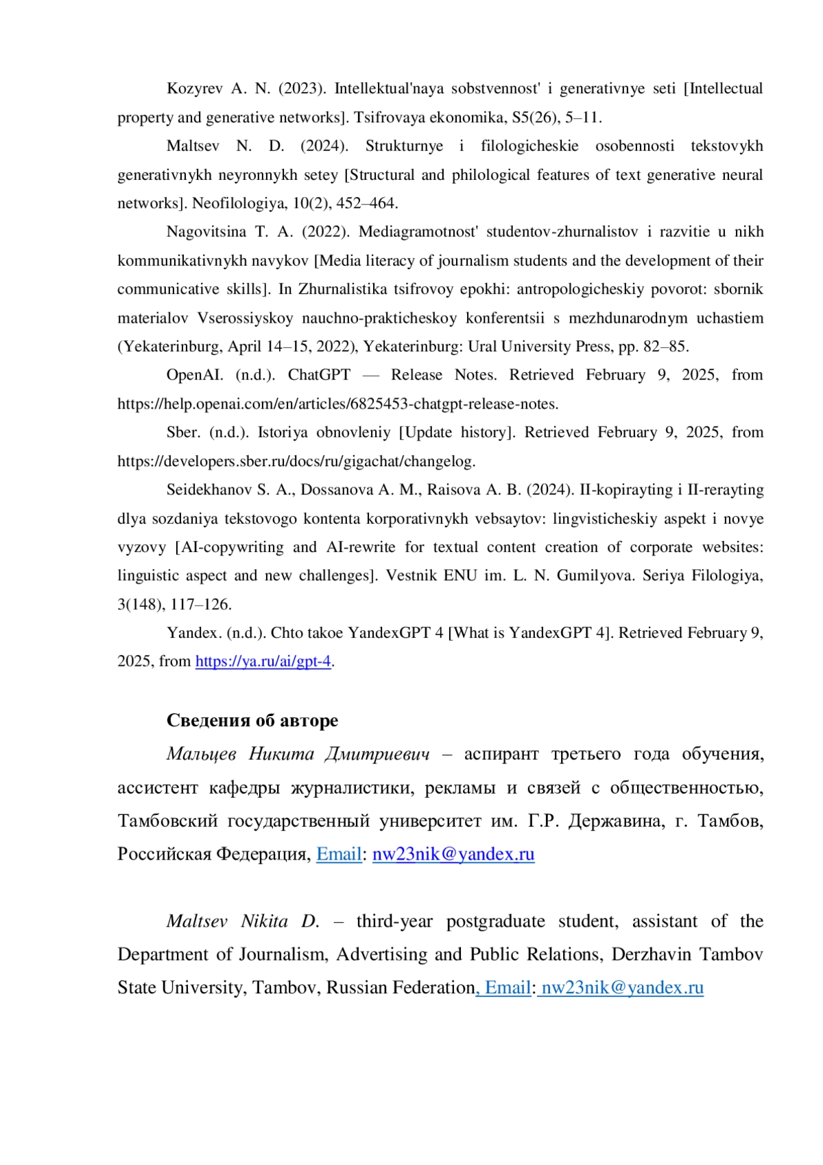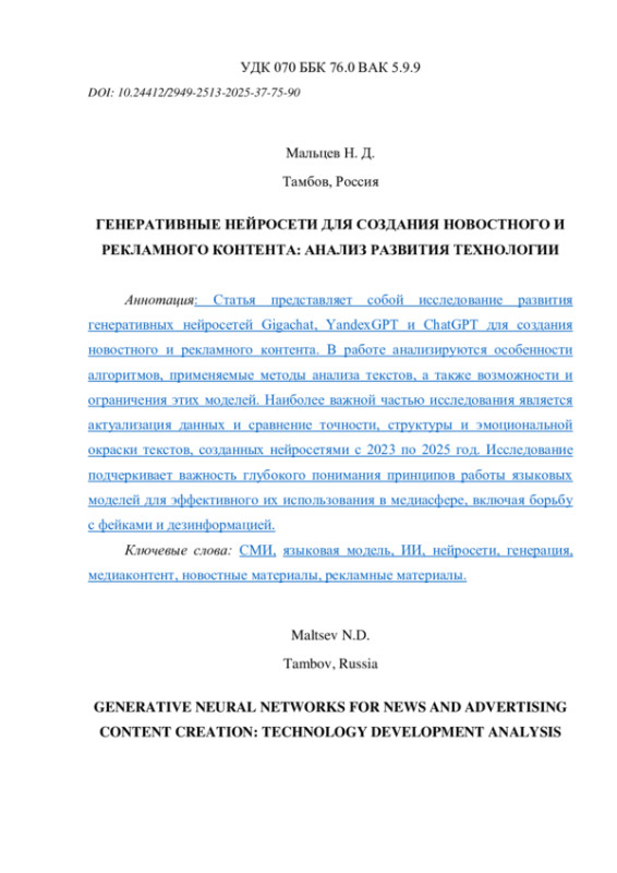 5. 	Мальцев Н. Д. Структурные и филологические особенности текстовых генеративных нейронных сетей // Неофилология. 2024. Т. 10, № 2. С. 452-464.