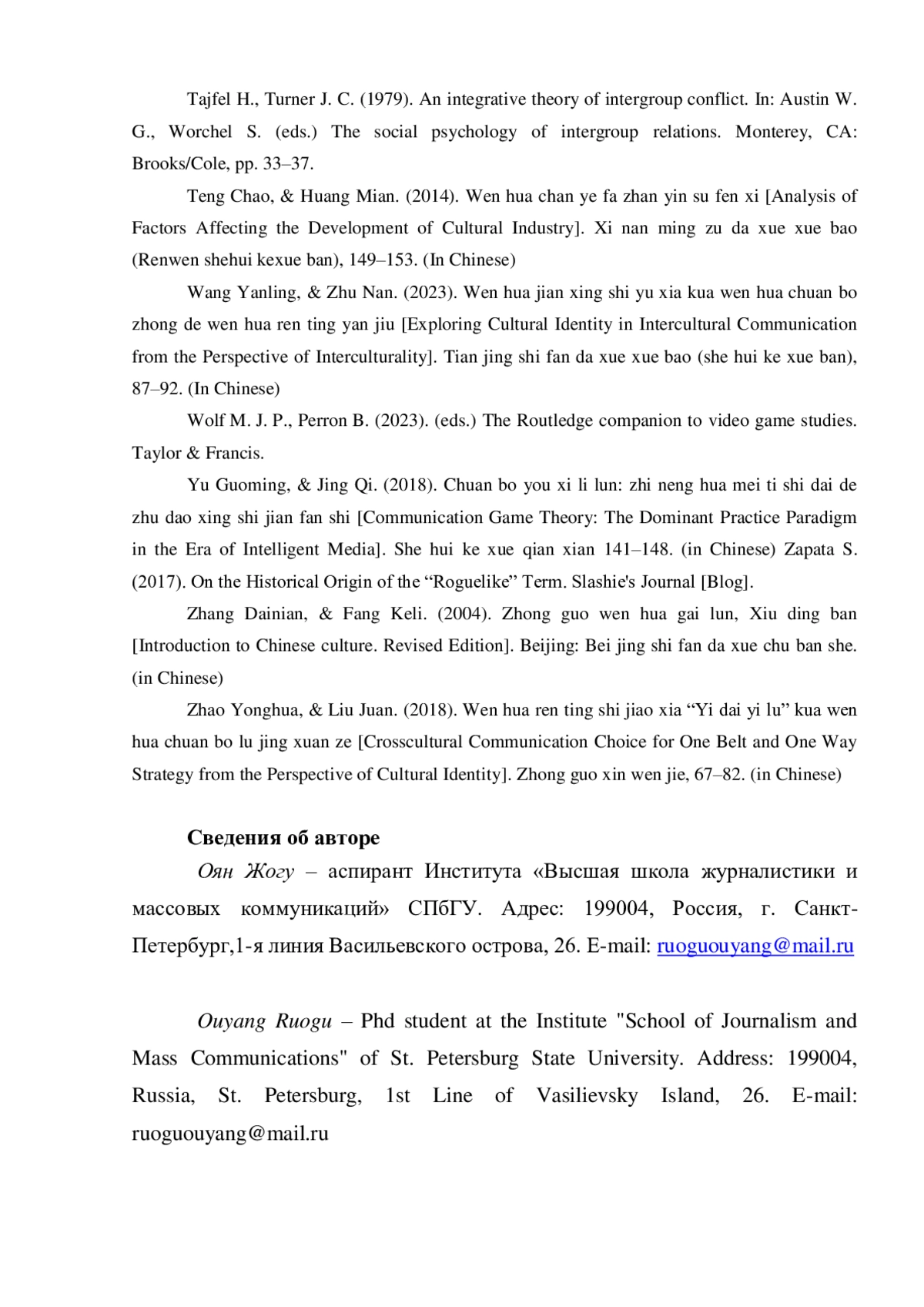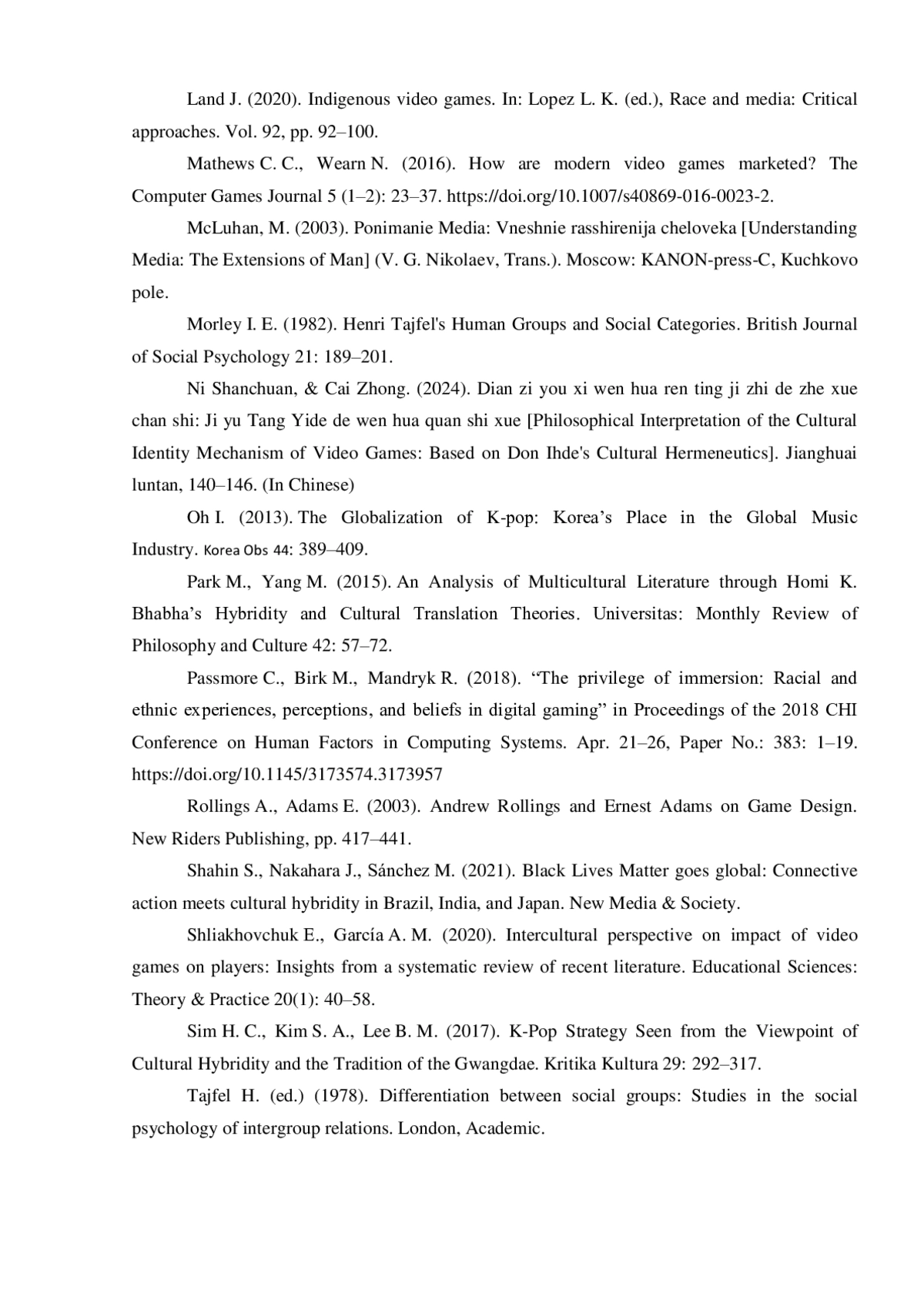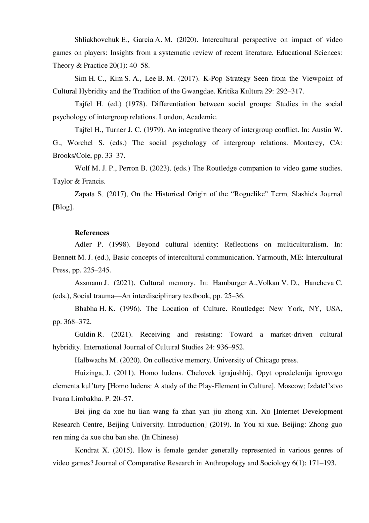 11. 	倪山川,蔡仲.电子游戏文化认同机制的哲学阐释-基于唐·伊德的文化诠释学[J].江淮论坛,2024, (03): 140-146. (Ни Шаньчуань, Цай Чжун. Философская интерпретация механизма культурной идентичности видеоигр, основанная на культурной герменевтике Дона Ихде // Форум Цзянхуай. 2024. № 3. С. 140-146) (на кит. яз.).