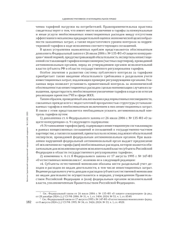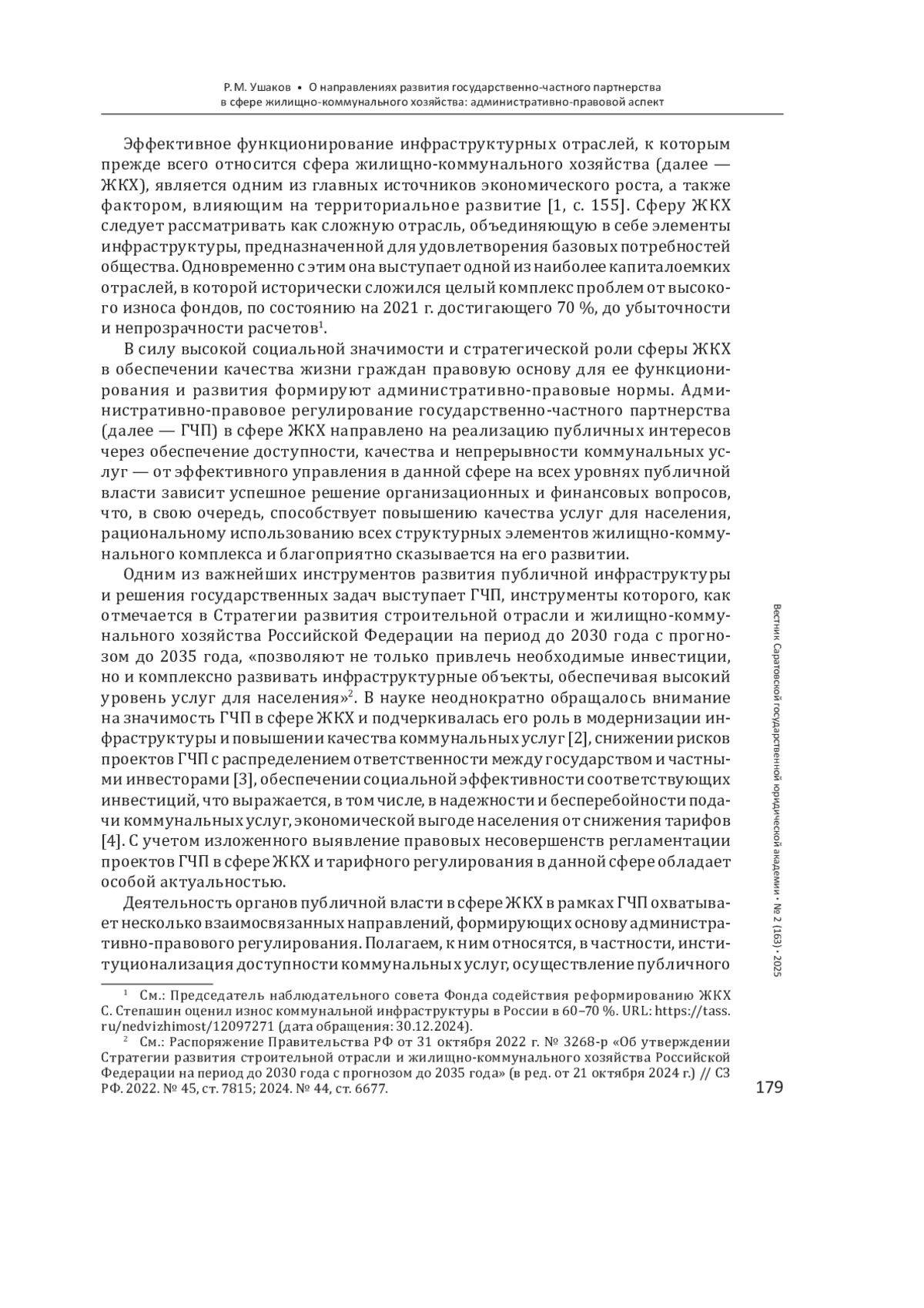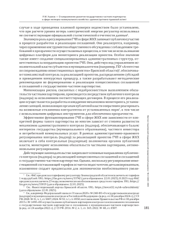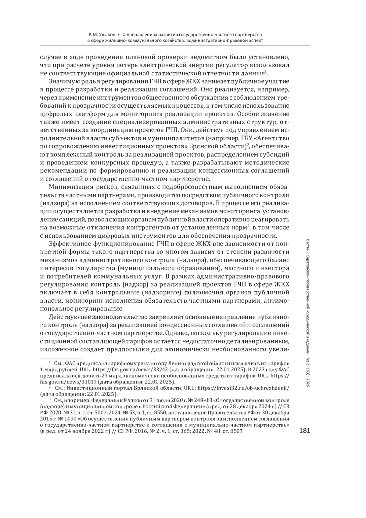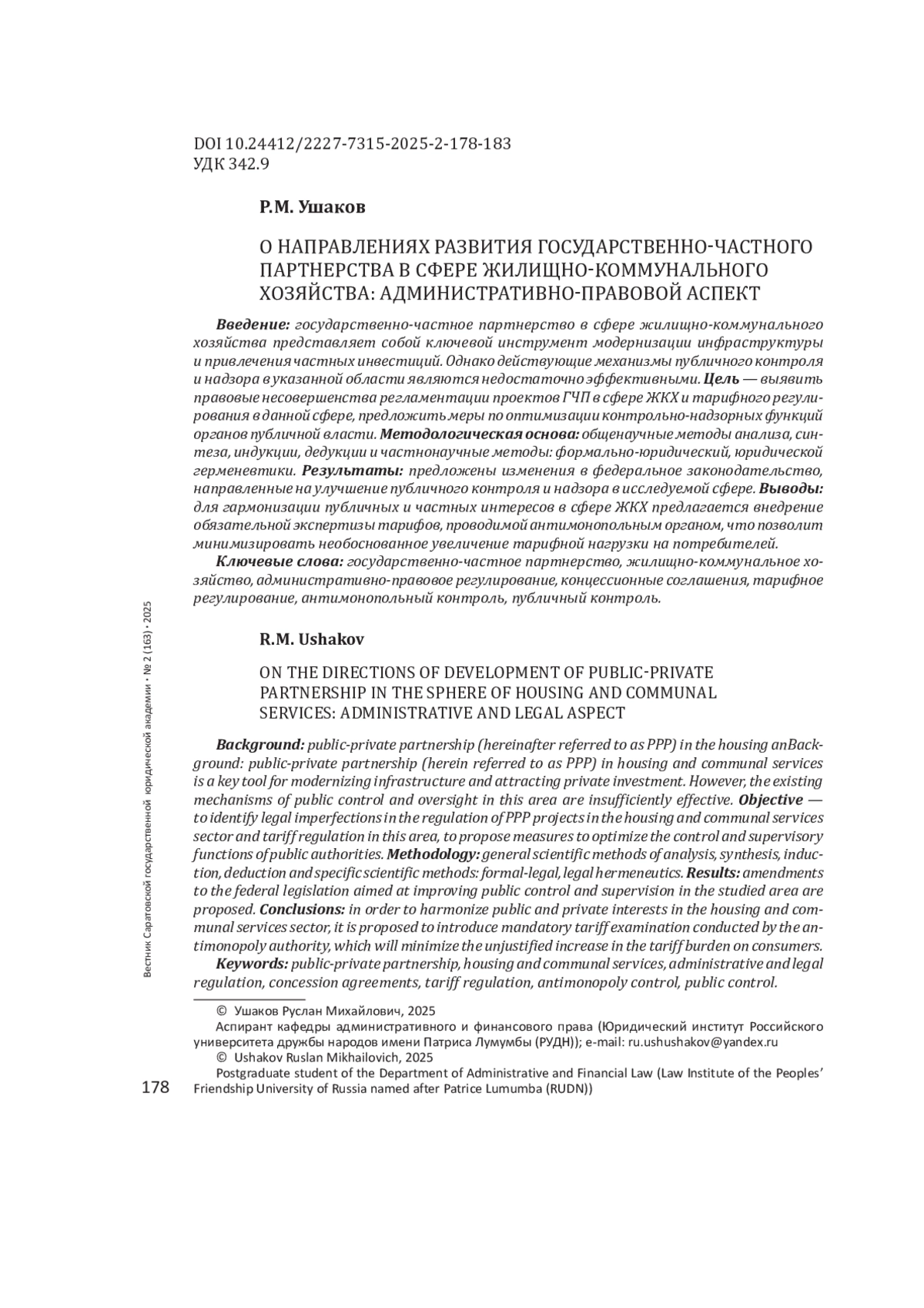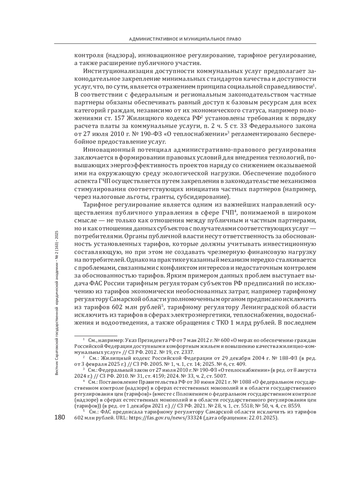 Введение: государственно-частное партнерство в сфере жилищно-коммунального хозяйства представляет собой ключевой инструмент модернизации инфраструктуры и привлечения частных инвестиций. Однако действующие механизмы публичного контроля и надзора в указанной области являются недостаточно эффективными. Цель - выявить правовые несовершенства регламентации проектов ГЧП в сфере ЖКХ и тарифного регулирования в данной сфере, предложить меры по оптимизации контрольно-надзорных функций органов публичной власти.