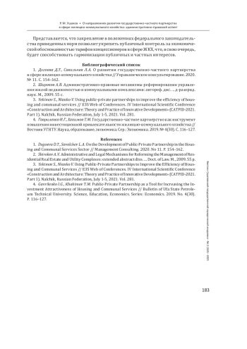 4. 	Гавриленко И.Г., Хакимов Т. М. Государственно-частное партнерство как инструмент повышения инвестиционной привлекательности жилищно-коммунального хозяйства // Вестник УГНТУ. Наука, образование, экономика. Сер.: Экономика. 2019. № 4(30). С. 116-127.