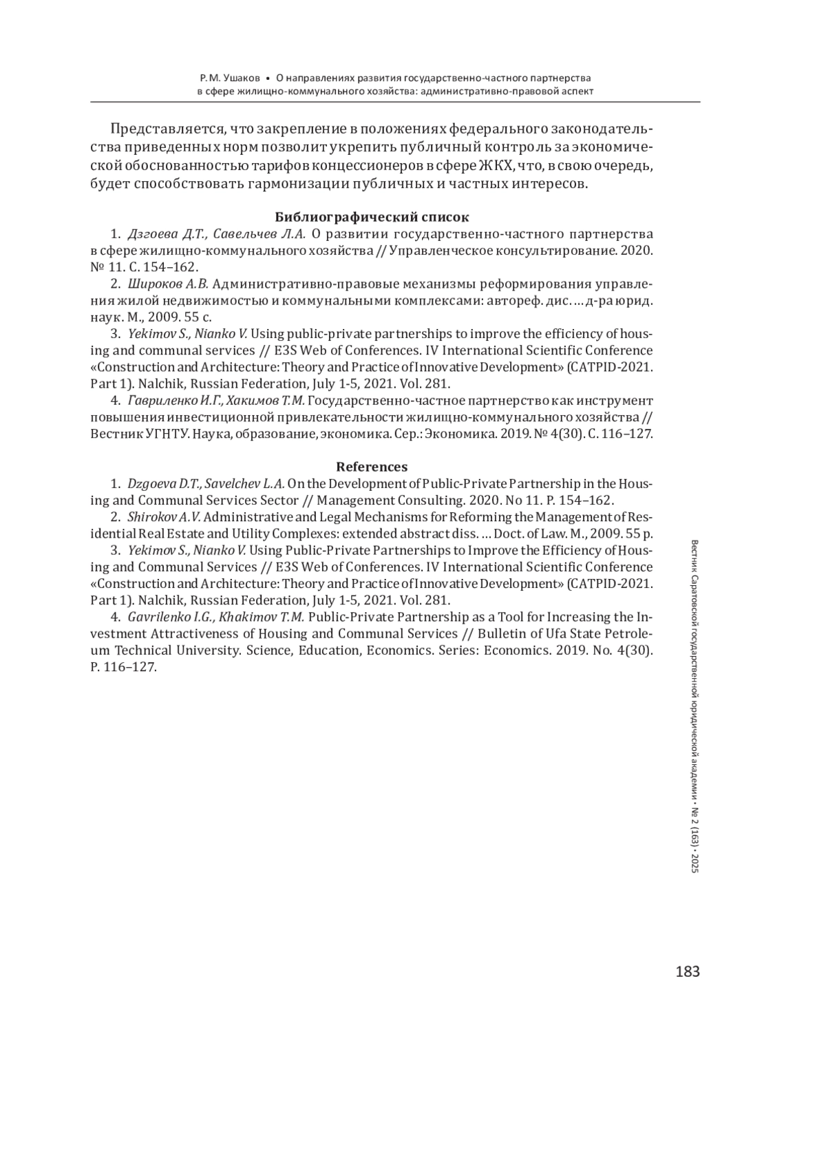 1. 	Дзгоева Д.Т., Савельчев Л.А. О развитии государственно-частного партнерства в сфере жилищно-коммунального хозяйства // Управленческое консультирование. 2020. № 11. С. 154-162. EDN: VXCIPX