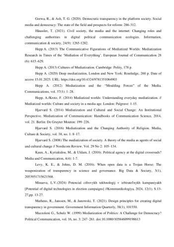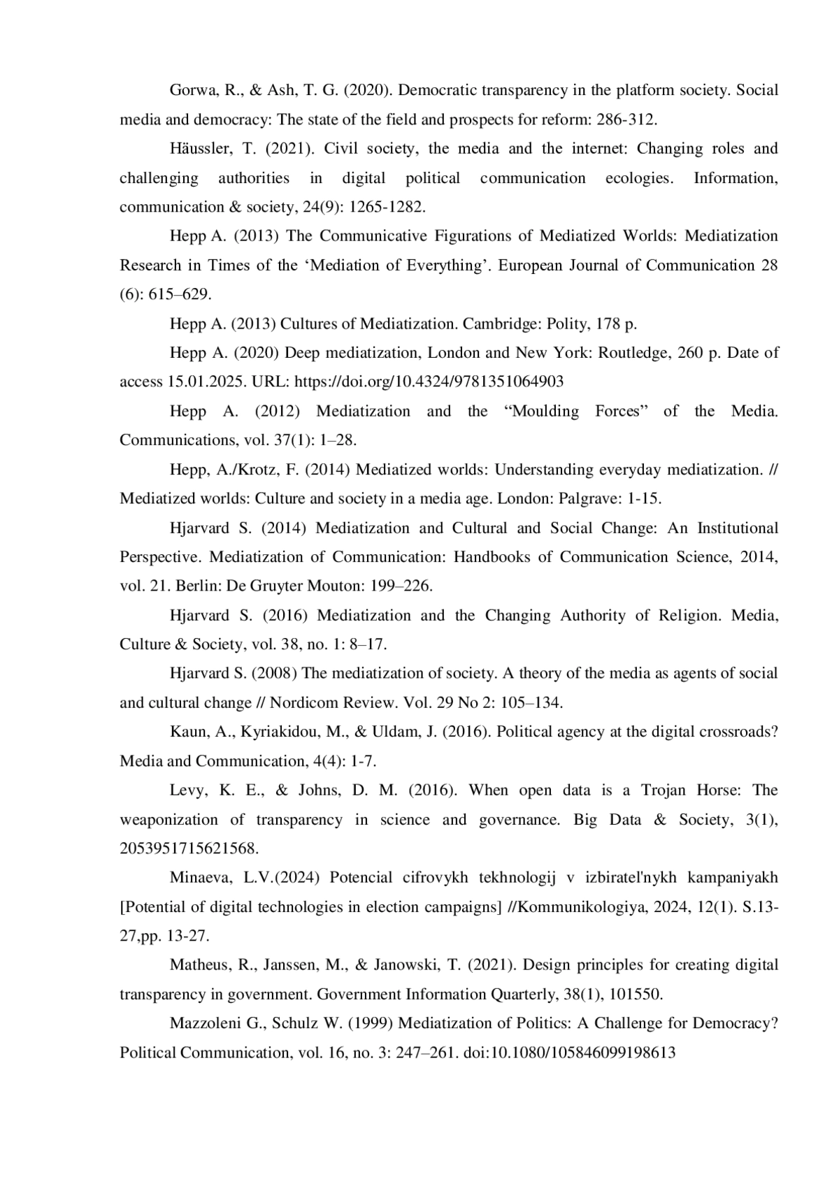 1. 	Гавра Д. П. Медиатизация 2.0 в процессах политической мобилизации в цифровом социуме // Медиа в современном мире. 60-е Петербургские чтения. СПб., 2021. Т. 2. С. 195-196.