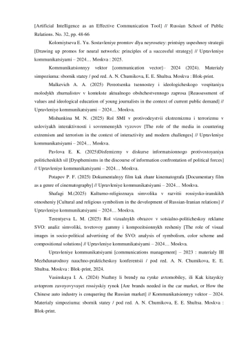 1. Арутюнова-Ястребкова Э. В., Колесникова Н. Л. Медиаобраз БРИКСванглоязычных СМИ (по материалам освещения саммита БРИКС 2024 г.) // Управление коммуникациями - 2024: материалы IV Международной научно-практической конференции / под ред. А. Н. Чумикова, Э. Э. Шульца. Москва: Блок-принт, 2025.