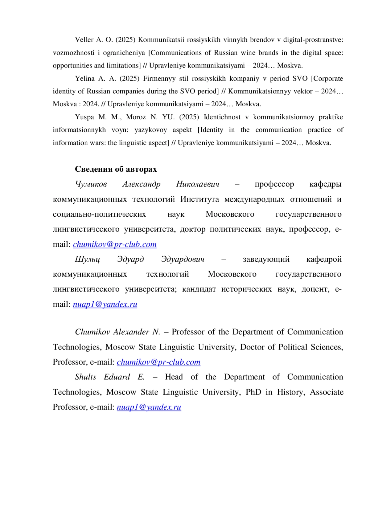 5. Веллер А. О. Коммуникации российских винных брендов в digital-пространстве: возможности и ограничения // Управление коммуникациями - 2024… Москва: 2025.