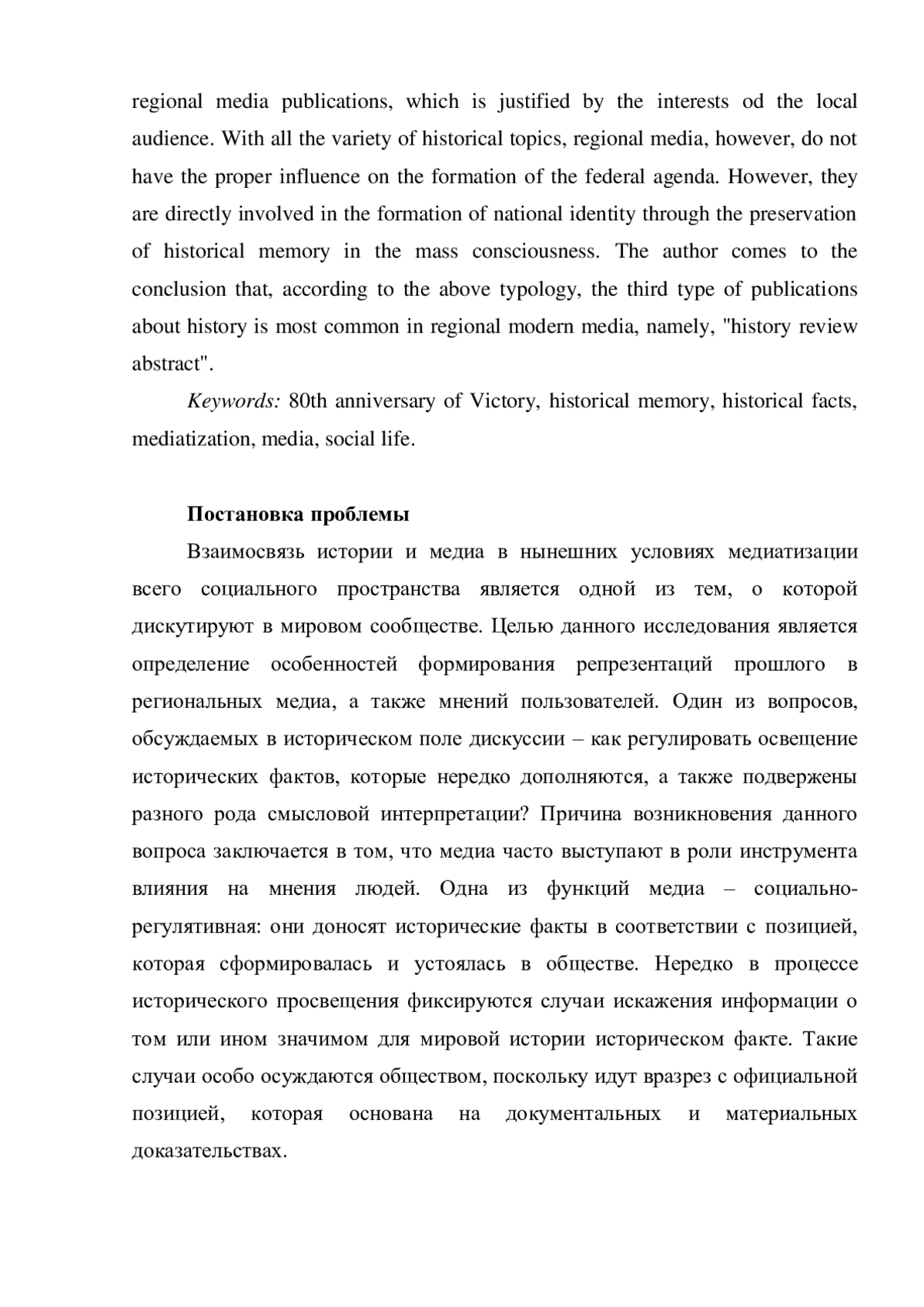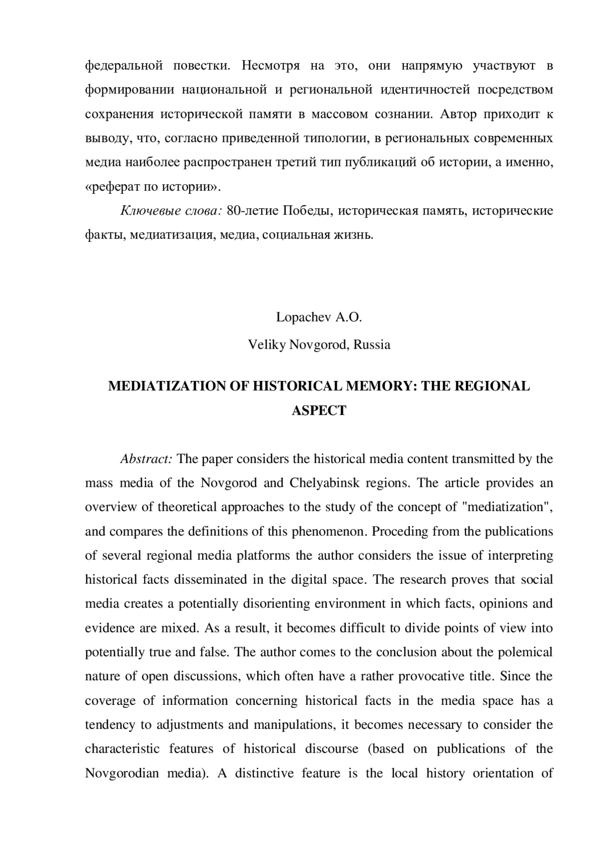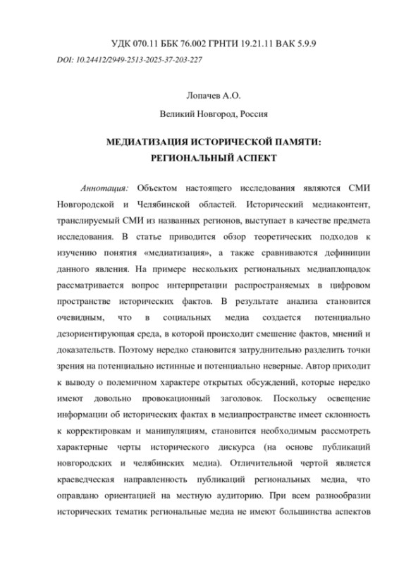 Объектом настоящего исследования являются СМИ Новгородской и Челябинской областей. Исторический медиаконтент, транслируемый СМИ из названных регионов, выступает в качестве предмета исследования. В статье приводится обзор теоретических подходов к изучению понятия «медиатизация», а также сравниваются дефиниции данного явления. На примере нескольких региональных медиаплощадок рассматривается вопрос интерпретации распространяемых в цифровом пространстве исторических фактов. В результате анализа становится очевидным, что в социальных медиа создается потенциально дезориентирующая среда, в которой происходит смешение фактов, мнений и доказательств. Поэтому нередко становится затруднительно разделить точки зрения на потенциально истинные и потенциально неверные. Автор приходит к выводу о полемичном характере открытых обсуждений, которые нередко имеют довольно провокационный заголовок. Поскольку освещение информации об исторических фактах в медиапространстве имеет склонность к корректировкам и манипуляциям, становится необходимым рассмотреть характерные черты исторического дискурса (на основе публикаций новгородских и челябинских медиа). Отличительной чертой является краеведческая направленность публикаций региональных медиа, что оправдано ориентацией на местную аудиторию. При всем разнообразии исторических тематик региональные медиа не имеют большинства аспектов федеральной повестки. Несмотря на это, они напрямую участвуют в формировании национальной и региональной идентичностей посредством сохранения исторической памяти в массовом сознании. Автор приходит к выводу, что, согласно приведенной типологии, в региональных современных медиа наиболее распространен третий тип публикаций об истории, а именно, «реферат по истории».