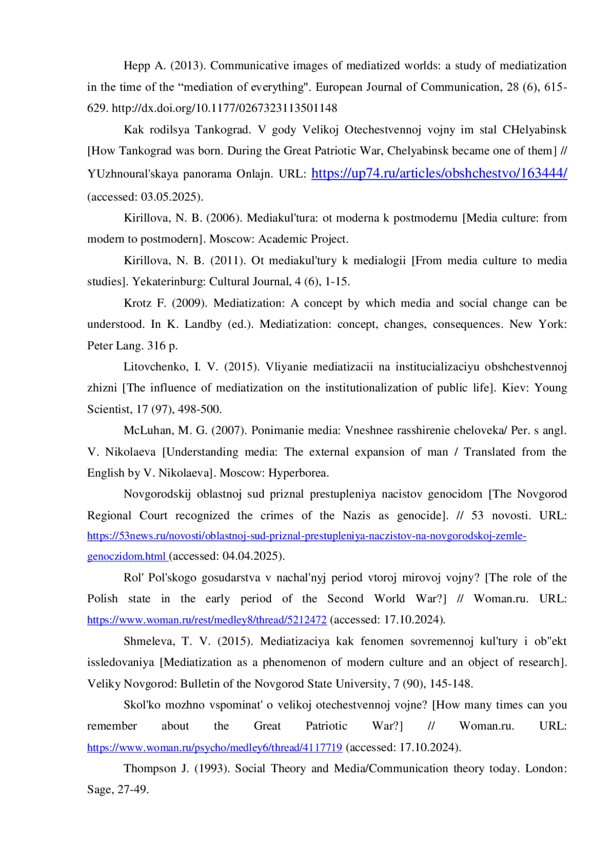 17. 	Кириллова Н. Б. От медиакультуры к медиалогии. Екатеринбург: Культурологический журнал, 4 (6), 2011. С. 1-15.