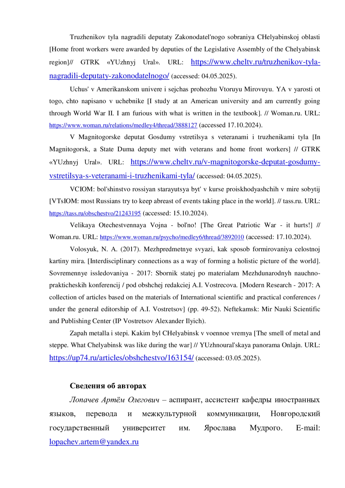 7. 	В Магнитогорске депутат Госдумы встретился с ветеранами и тружениками тыла // ГТРК “Южный Урал”. Дата размещения: 22.04.2025. Дата обращения: 04.05.2025. URL: https://www.cheltv.ru/v-magnitogorske-deputat-gosdumy-vstretilsya-s-veteranami-i-truzhenikami-tyla.
