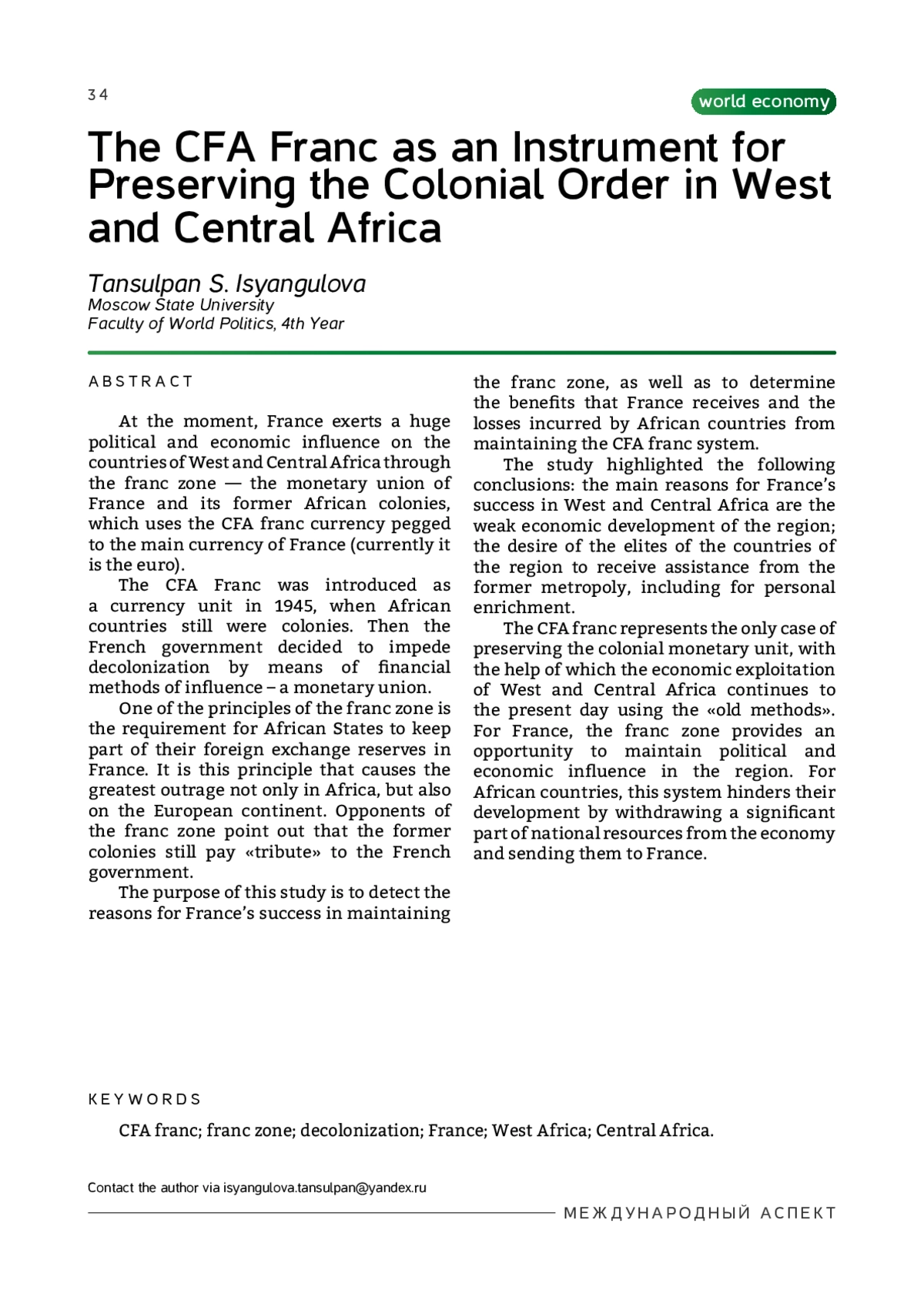 Цель настоящего исследования состоит в том, чтобы установить причины успеха Франции в сохранении зоны франка, а также в том, чтобы определить выгоды, которые получает Франция, и убытки, которые несут африканские страны от сохранения системы франка КФА.