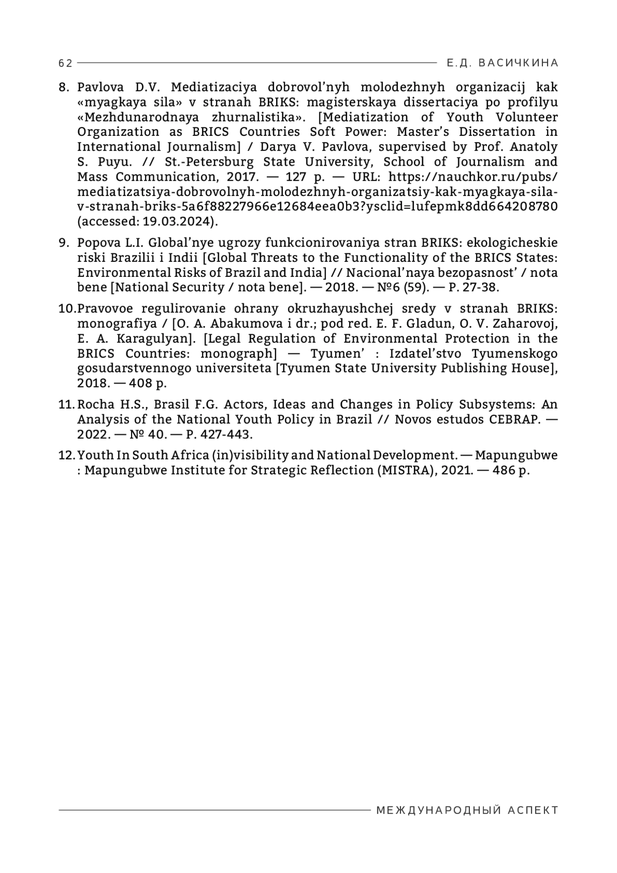 Таким образом, молодежное сотрудничество стран БРИКС в экологической сфере является достаточно перспективным направлением, которое необходимо развивать, основываясь на принципах преемственности, равного диалога и поддержки со стороны государств блока БРИКС.