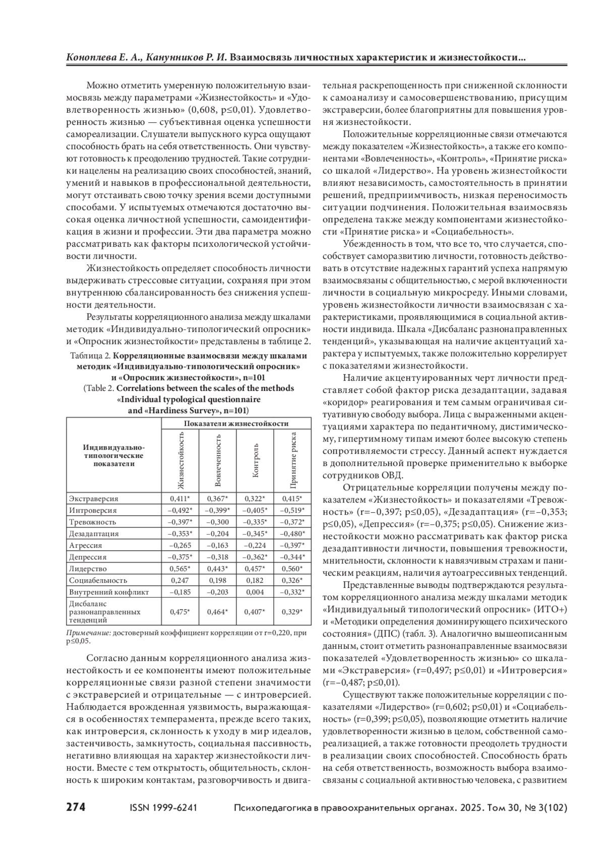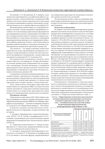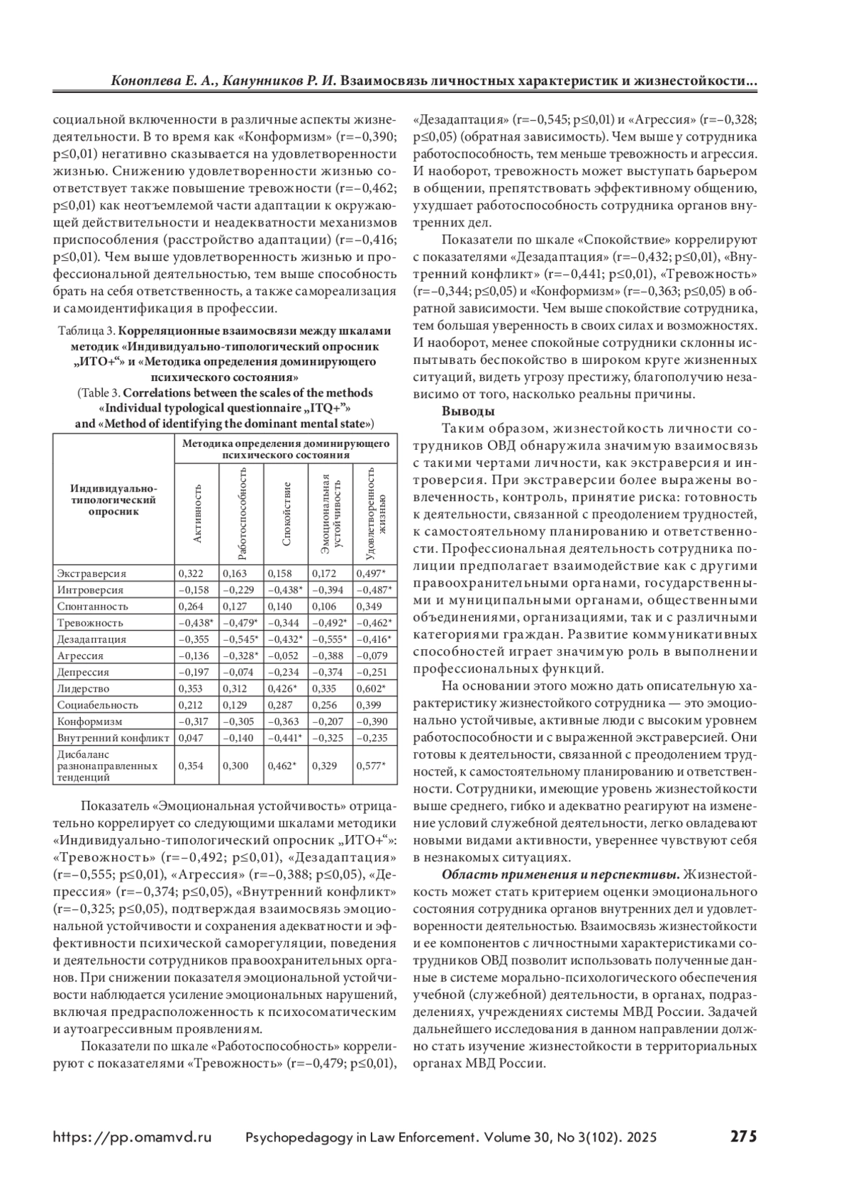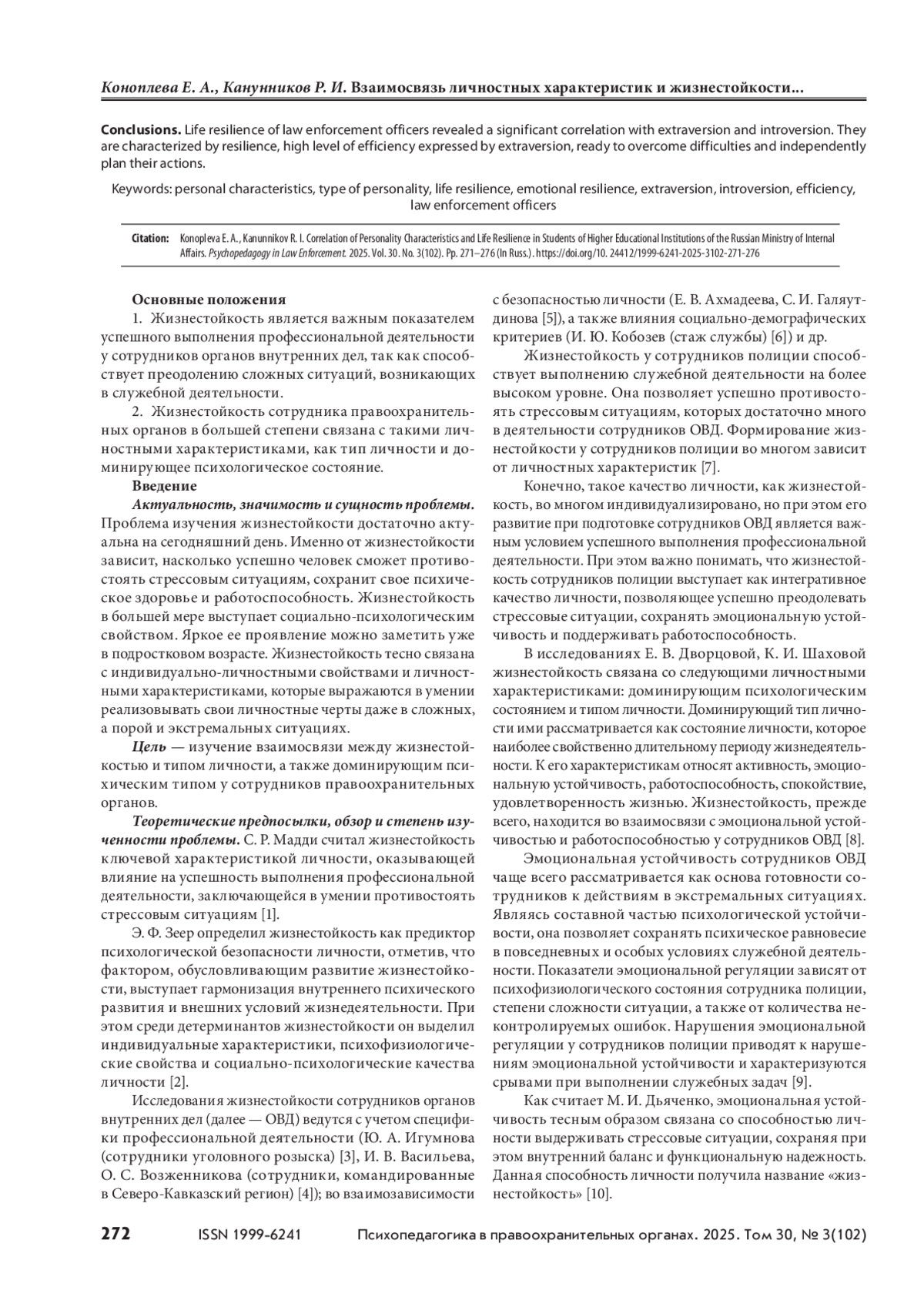 Актуальность данной работы заключается в исследовании взаимосвязи между личностными характеристиками и жизнестойкостью у сотрудников органов внутренних дел, непосредственно влияющих на выполнение служебной деятельности. В настоящее время данная проблема недостаточно проработана. Цель — изучение взаимосвязи между жизнестойкостью и типом личности, а также доминирующим психическим типом у сотрудников правоохранительных органов. Материалы и методы. Экспериментальная база исследования: респонденты — мужчины и женщины в возрасте от 21 года до 23 лет. Общий объем выборки — 101 человек. Методы исследования: методика «Индивидуально-типологический опросник „ИТО+“» Л. Н. Собчик (в модификации К. В. Сугоняева), «Опросник жизнестойкости» С. Р. Мадди (в модификации Д. А. Леонтьева), методика определения доминирующего психического состояния Л. В. Куликова (в модификации К. В. Сугоняева, 6-шкальная форма). Для реализации целей и задач исследования применен корреляционный анализ с использованием коэффициента ранговой корреляции Спирмена. Результаты и обсуждение. В ходе проведения корреляционного анализа было установлено наличие взаимосвязи между жизнестойкостью и типом личности, а также доминирующим психическим типом у сотрудников органов внутренних дел. Выявлено, что сотрудники с экстравертированным типом и высокой работоспособностью являются наиболее жизнестойкими. Выводы. Жизнестойкость личности сотрудников органов внутренних дел обнаружила значимую взаимосвязь с экстраверсией и интроверсией. Они характеризуются устойчивостью, высоким уровнем работоспособности, выраженной экстраверсией, готовы к преодолению трудностей и самостоятельному планированию действий.