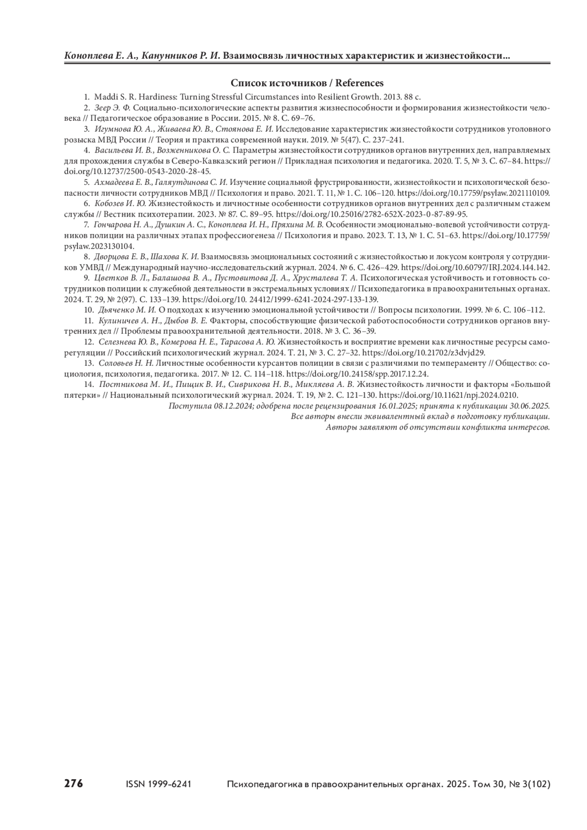 6. Кобозев И. Ю. Жизнестойкость и личностные особенности сотрудников органов внутренних дел с различным стажем службы // Вестник психотерапии. 2023. № 87. C. 89–95. https://doi.org/10.25016/2782-652X-2023-0-87-89-95.