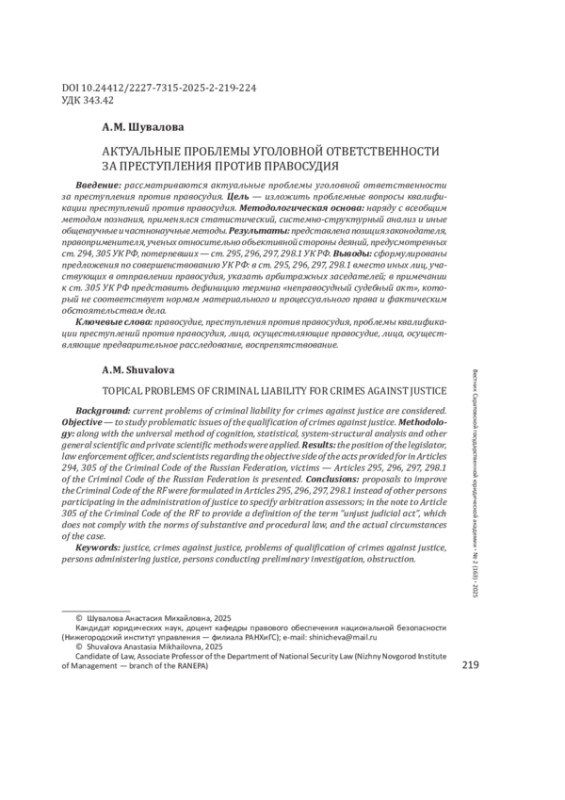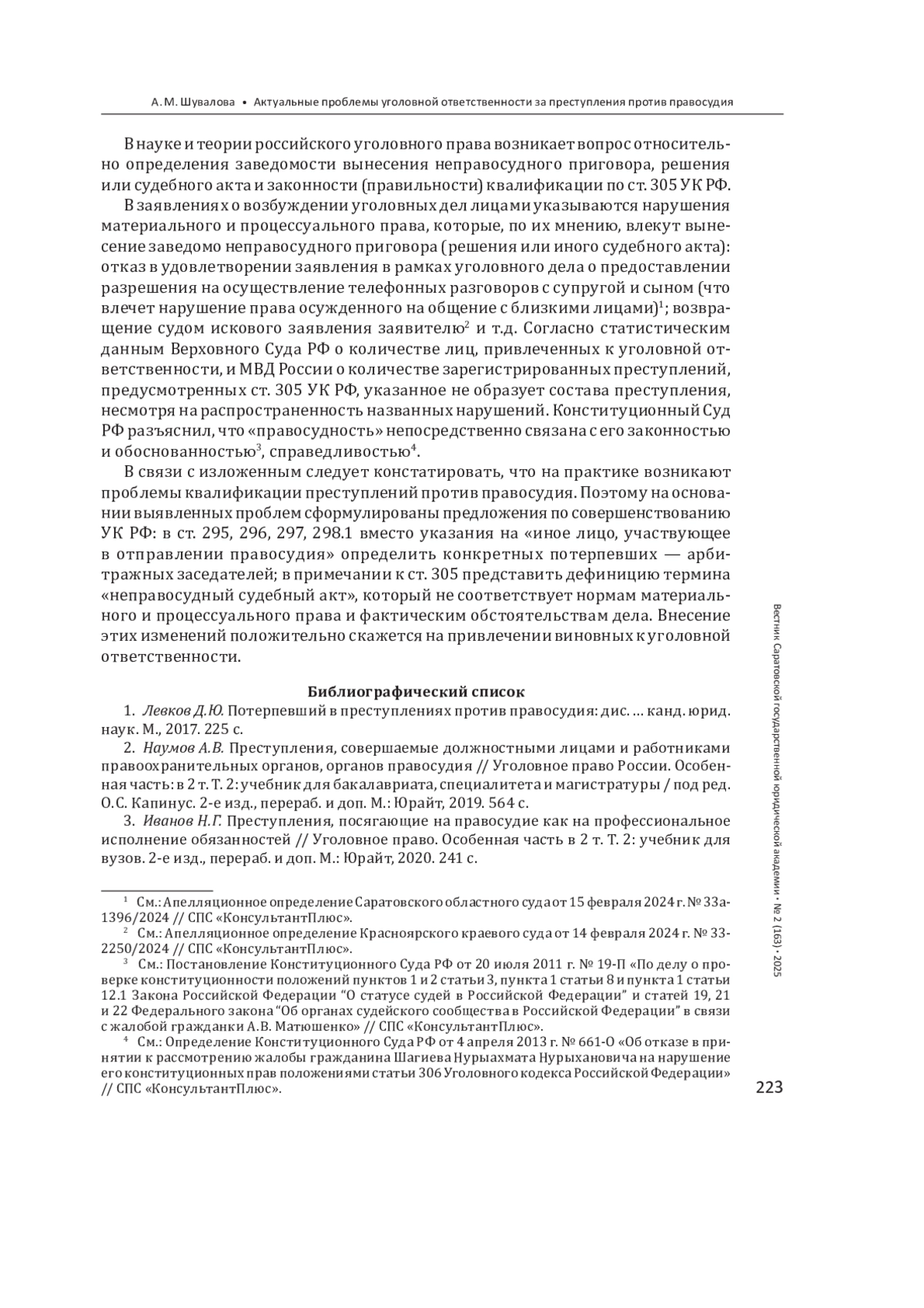 1. Левков Д. Ю. Потерпевший в преступлениях против правосудия: дис. … канд. юрид. наук. М., 2017. 225 с. EDN: HWOVRH