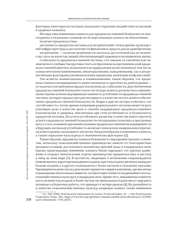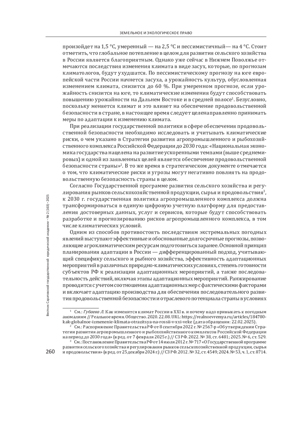 Введение: в статье рассматриваются направления развития экологического законодательства и практики применения адаптационных мер, реализуемых в сфере обеспечения продовольственной безопасности России. Цель - проанализировать правовые основы и содержание правового механизма сдерживания климатических и агроэкологических угроз, обусловленных последствиями природных чрезвычайных ситуаций.