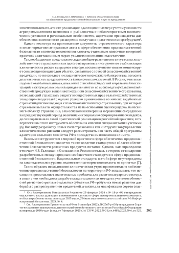 Вывод: исследования климатических угроз применительно к обеспечению продовольственной безопасности на территории РФ показывает, что последние представляют значительные проблемы для развития аграрного сектора, в связи с чем необходимым представляется разработка инновационных адаптационных методов с учетом климатических особенностей различных регионов страны. Между тем внедрение инноваций должно сопровождаться государственной поддержкой, разработкой новых или адаптацией существующих технологий, утверждением стандартов в области обеспечения безопасности различных продуктов питания, изменением вида аграрной деятельности и торговли, а также созданием разнообразных схем страхования от последствий климатических изменений.