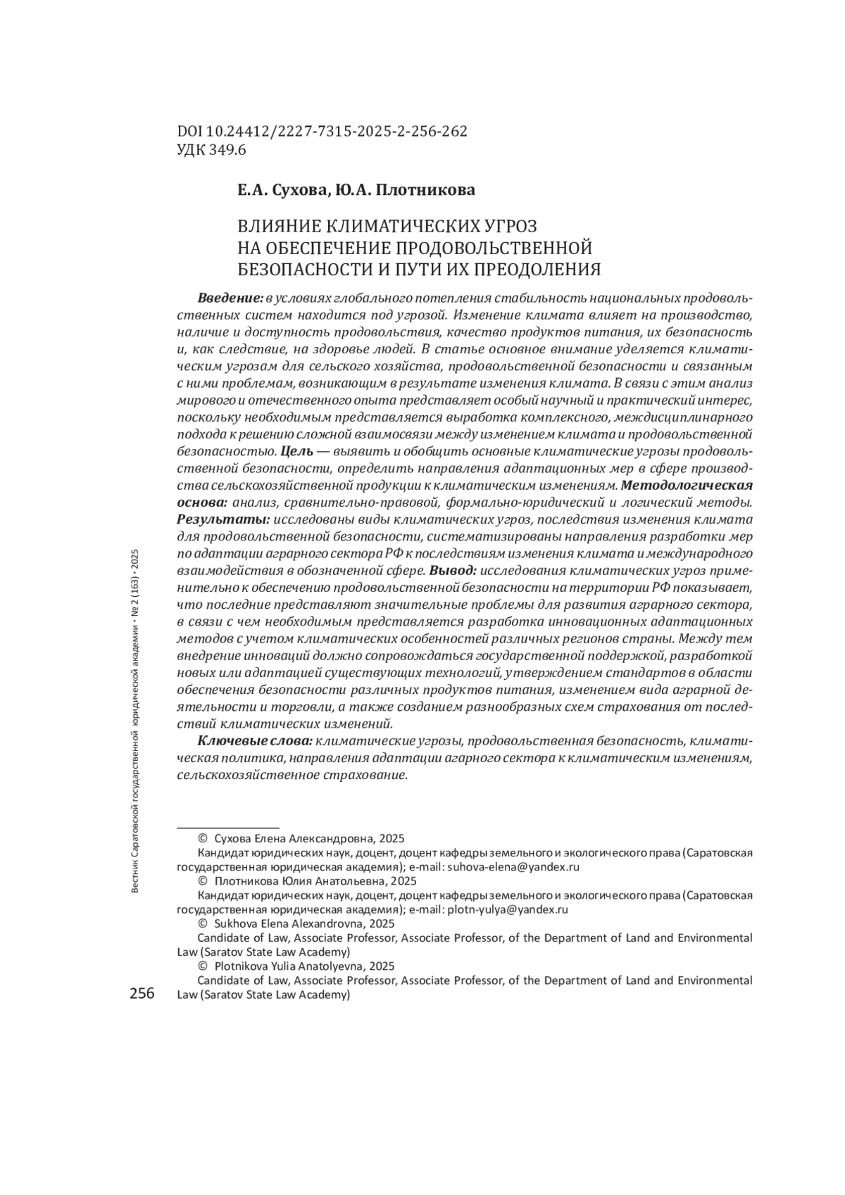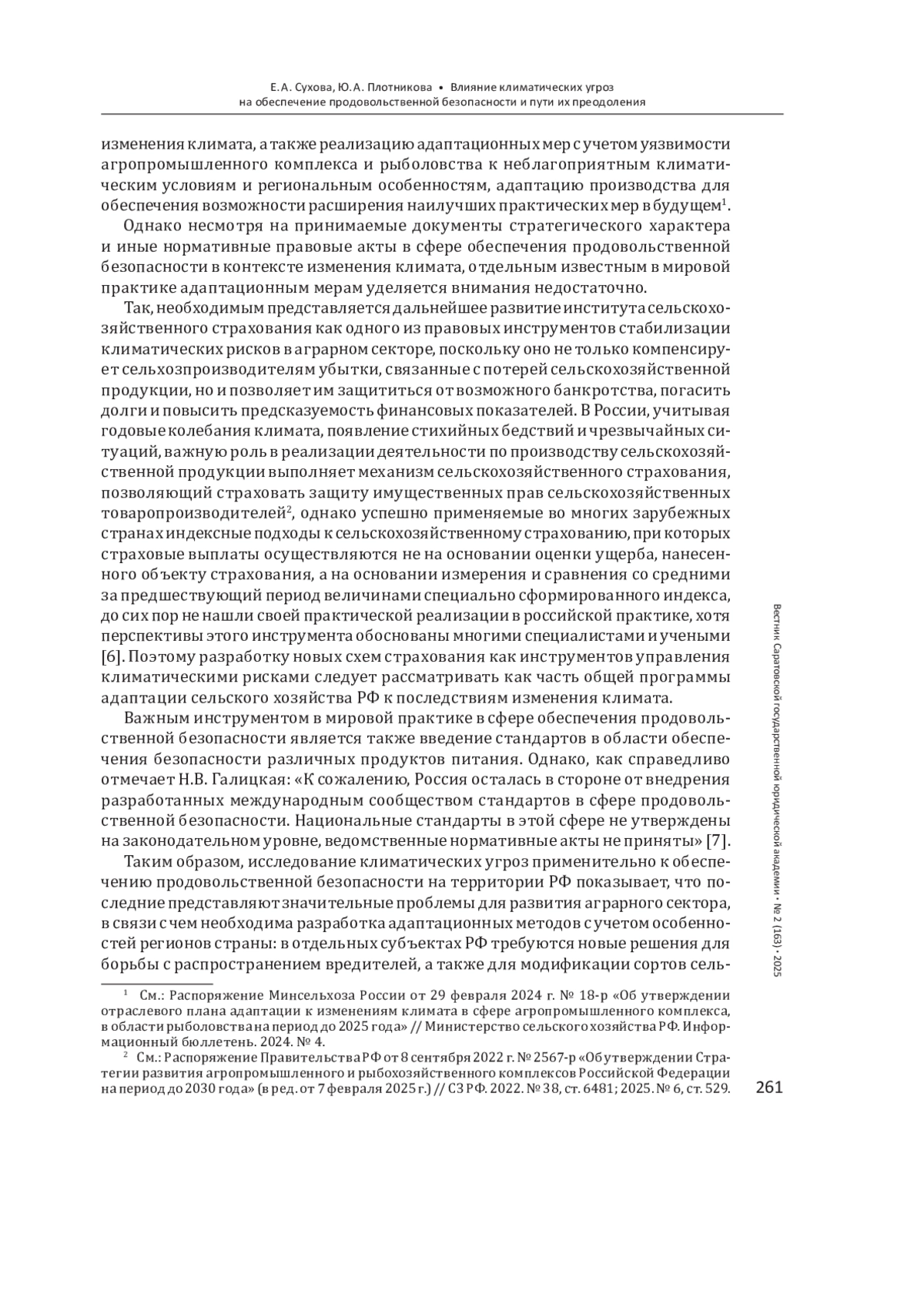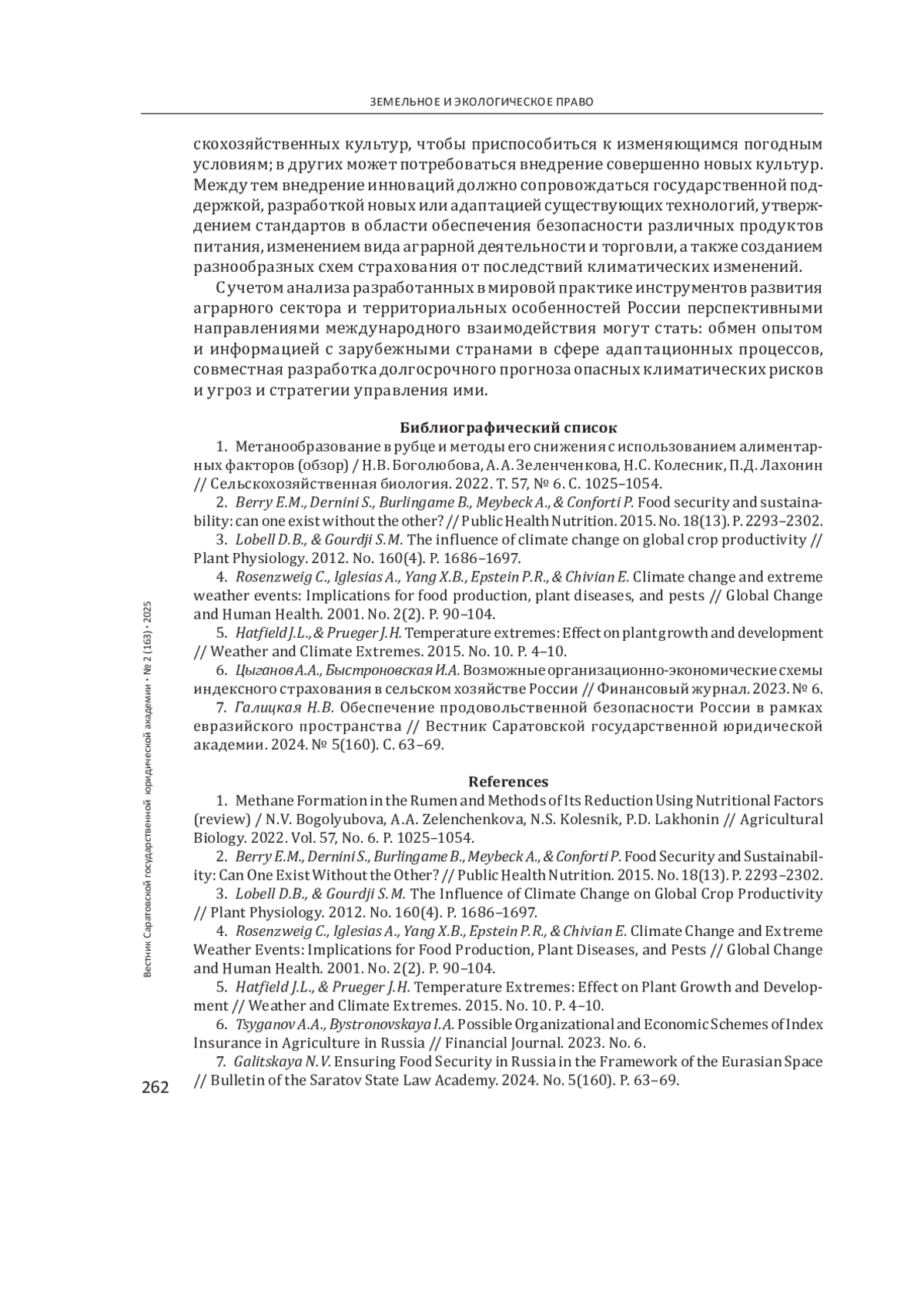 7. 	Галицкая Н. В. Обеспечение продовольственной безопасности России в рамках евразийского пространства // Вестник Саратовской государственной юридической академии. 2024. № 5(160). С. 63-69.