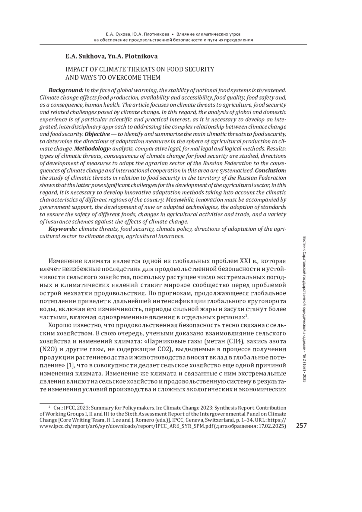 Введение: в условиях глобального потепления стабильность национальных продовольственных систем находится под угрозой. Изменение климата влияет на производство, наличие и доступность продовольствия, качество продуктов питания, их безопасность и, как следствие, на здоровье людей. В статье основное внимание уделяется климатическим угрозам для сельского хозяйства, продовольственной безопасности и связанным с ними проблемам, возникающим в результате изменения климата. В связи с этим анализ мирового и отечественного опыта представляет особый научный и практический интерес, поскольку необходимым представляется выработка комплексного, междисциплинарного подхода к решению сложной взаимосвязи между изменением климата и продовольственной безопасностью. Цель - выявить и обобщить основные климатические угрозы продовольственной безопасности, определить направления адаптационных мер в сфере производства сельскохозяйственной продукции к климатическим изменениям.