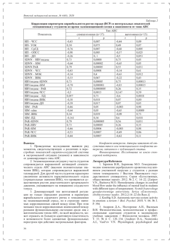 Цель данного исследования – выявить особенности перестроек показателей сердечно-сосудистой системы у лиц молодого возраста во время сдачи экзаменов в зависимости от доминирующего типа АНС (автономной нервной системы). Провести анализ корреляционных связей параметров вариабельности сердечного ритма (ВСР) и гемодинамики. В исследовании приняли участие студентки медицинского вуза в возрасте от 17 до 22 лет. Для оценки периферического кровотока и вариабельности сердечного ритма использовали пульсоксиметр «ЭЛОКС-01». Изучены параметры вариабельности сердечного ритма и гемодинамики (центральной и периферической) у студентов во время сдачи экзаменов. Проанализированы значимые корреляции параметров вариабельности сердечного ритма с показателями гемодинамики в зависимости от доминирующего типа АНС. Статистический анализ результатов исследования выполнен с использованием аналитического пакета «Statistica», 10.0. Установлено, что на экзаменах отмечается четко выраженное изменение вегетативного статуса студентов, обусловленное активацией симпатического отдела вегетативной нервной системы. Проведенные исследования показали, что экзаменационная ситуация приводит к перестройке сердечно-сосудистой системы и кардиоритма. Показано, что тип вегетативной регуляции не только определяет различия в параметрах вариабельности сердечного ритма и гемодинамики на экзаменационный стресс, но и структуру значимых корреляционных связей между ними. Характер перестройки сердечно-сосудистой системы на экзаменационный стресс зависит от доминирующего типа АНС. Анализ взаимосвязей изучаемых показателей у студентов с различным типом вегетативной регуляции приводит к выводу о прогностической значимости оценки исходного вегетативного тонуса.