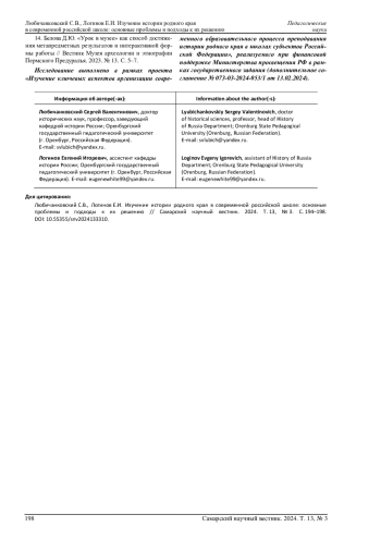 13. Третьякова С.А., Мелешко О.П. Возможности использования новых форм и методов исторического краеведения на уроках истории // StudNet. 2022. № 1. С. 241-247. EDN: UTWKBL