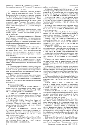 19. 	Eltsova L., Ivanova E., Komov V., Mizgireva I., Kopylov D., Kuznetsova L., Barinova M., Platonova E., Rumiantseva O., Savkova I., Poddubnaya N. Isotope signatures of Carnivorans hair in the North-West of Russia: the role of diet, behavior and metabolism // European Journal of Wildlife Research. 2024. Vol. 70, iss. 5. DOI: 10.1007/s10344-024-01851-x EDN: RUHTXM