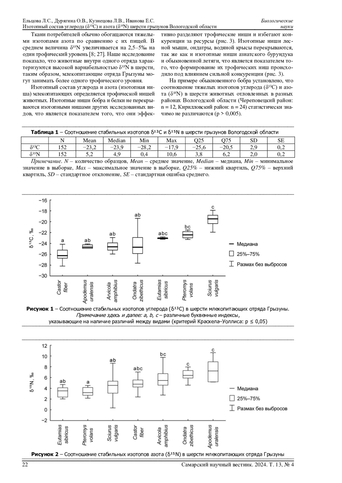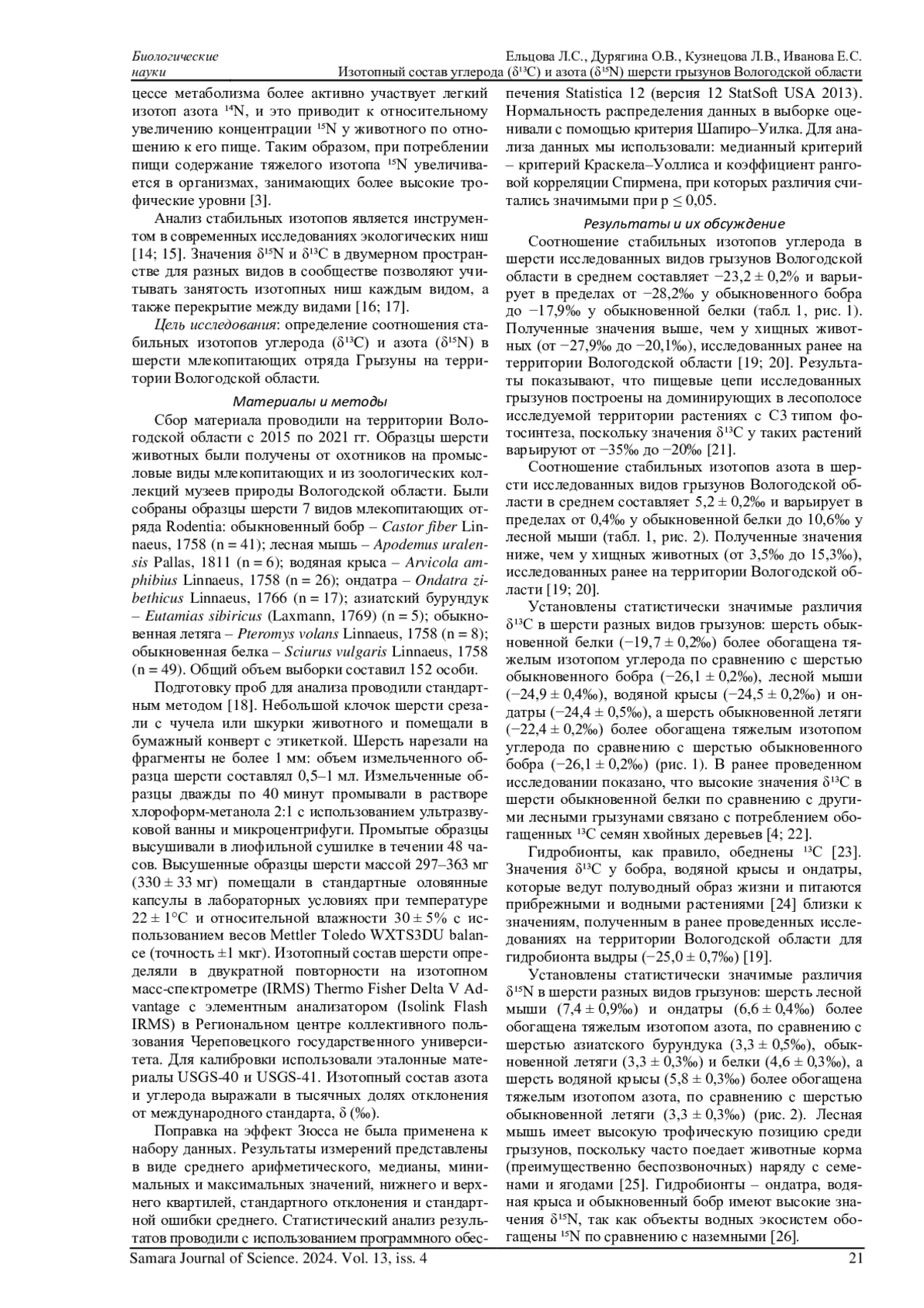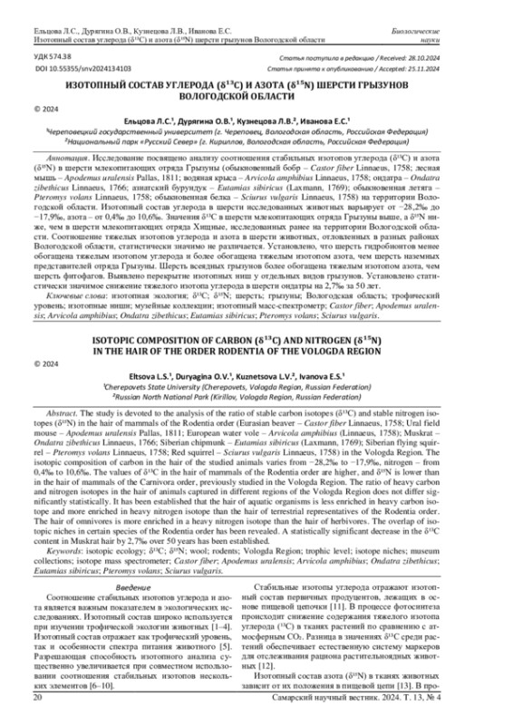Исследование посвящено анализу соотношения стабильных изотопов углерода (ẟ¹³C) и азота (ẟ¹⁵N) в шерсти млекопитающих отряда Грызуны (обыкновенный бобр - Castor fiber Linnaeus, 1758; лесная мышь - Apodemus uralensis Pallas, 1811; водяная крыса - Arvicola amphibius Linnaeus, 1758; ондатра - Ondatra zibethicus Linnaeus, 1766; азиатский бурундук - Eutamias sibiricus (Laxmann, 1769); обыкновенная летяга - Pteromys volans Linnaeus, 1758; обыкновенная белка - Sciurus vulgaris Linnaeus, 1758) на территории Вологодской области. Изотопный состав углерода в шерсти исследованных животных варьирует от -28,2‰ до -17,9‰, азота - от 0,4‰ до 10,6‰. Значения ẟ¹³C в шерсти млекопитающих отряда Грызуны выше, а ẟ¹⁵N ниже, чем в шерсти млекопитающих отряда Хищные, исследованных ранее на территории Вологодской области. Соотношение тяжелых изотопов углерода и азота в шерсти животных, отловленных в разных районах Вологодской области, статистически значимо не различается. Установлено, что шерсть гидробионтов менее обогащена тяжелым изотопом углерода и более обогащена тяжелым изотопом азота, чем шерсть наземных представителей отряда Грызуны. Шерсть всеядных грызунов более обогащена тяжелым изотопом азота, чем шерсть фитофагов. Выявлено перекрытие изотопных ниш у отдельных видов грызунов. Установлено статистически значимое снижение тяжелого изотопа углерода в шерсти ондатры на 2,7‰ за 50 лет.