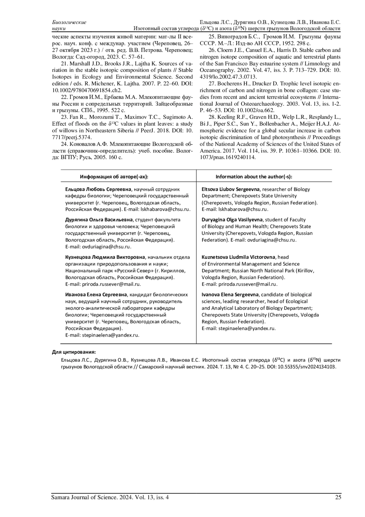 20. 	Ельцова Л.С., Иванова Е.С., Комов В.Т., Мизгирева И.Ю., Кузнецова Л.В., Баринова М.С., Савкова И.С., Платонова Е.В. Изотопная подпись хищных млекопитающих Северо-Запада России // Эволюционные и экологические аспекты изучения живой материи: мат-лы II всерос. науч. конф. с междунар. участием (Череповец, 26-27 октября 2023 г.) / отв. ред. В.В. Петрова. Череповец; Вологда: Сад-огород, 2023. С. 57-61. EDN: GUXXKV