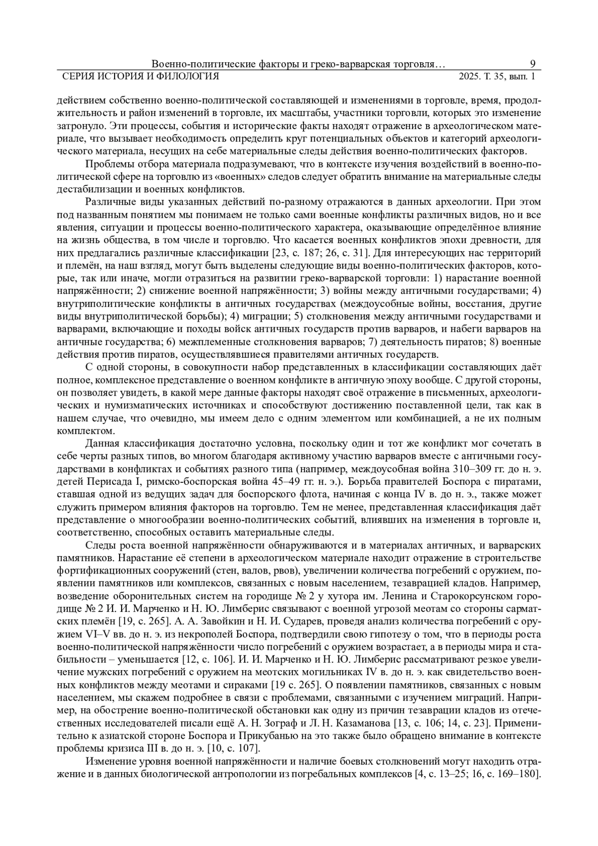 Военно-политические факторы, наряду с другими, оказывали сильное воздействие на развитие греко-варварской торговли. Однако в археологическом материале следы «военной» и «торговой» групп свидетельств лишь частично соприкасаются физически друг с другом на археологических объектах, к тому же методика их изучения различна [32, p. 116–132; 7, с. 22–25; 30, p. 59–99]: исследователями они изучаются сначала изолированно друг от друга, и уже при реконструкции процессов и событий возникает возможность, а в нашем случае необходимость, сопоставить данные по обеим группам в контексте заявленной проблемы.