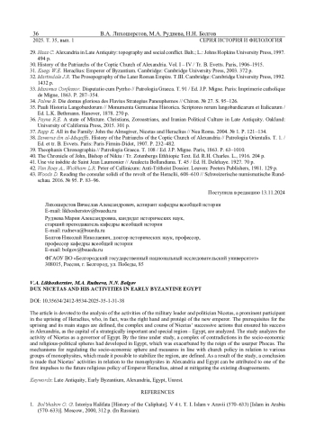 11. 	Руднева М.А. Александрия в ранневизантийское время: общественные волнения и конфликты // Via in Tempore. История. Политология. 2020. Т. 47. № 3. С. 518-524. EDN: YZNEUC