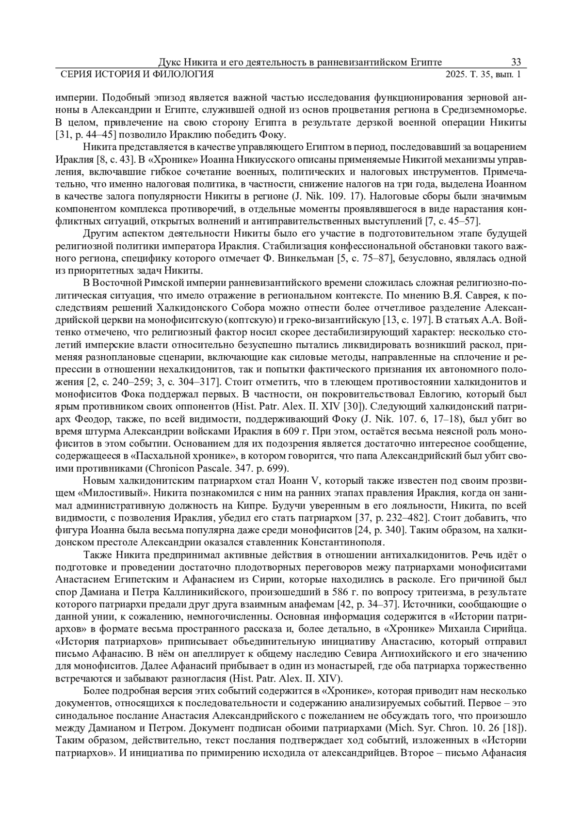 Статья посвящена анализу деятельности военачальника и политика Никиты - заметного участника восстания Ираклия, который, фактически, являлся правой рукой и ставленником нового императора. Охарактеризованы предпосылки восстания и его основные этапы, проанализирован комплекс и ход последовательных действий Никиты, обеспечившие его успех в Александрии, как столице стратегически важного и специфического региона - Египта. В исследовании анализируется деятельность Никиты в качестве наместника в регионе. К исследуемому времени здесь сложился комплекс противоречий в социально-экономической и религиозно-политической сферах, который обострился в результате правления узурпатора Фоки. Определены механизмы регулирования социально-экономической сферы и мероприятия в русле церковной политики в отношении различных групп монофиситов, позволившие стабилизировать регион. В результате исследования сделан вывод о том, что деятельность Никиты по отношению к монофиситам в Александрии и Египте можно отнести к одному из первых импульсов грядущей религиозной политики императора Ираклия, направленной на смягчение и устранение существовавших разногласий.