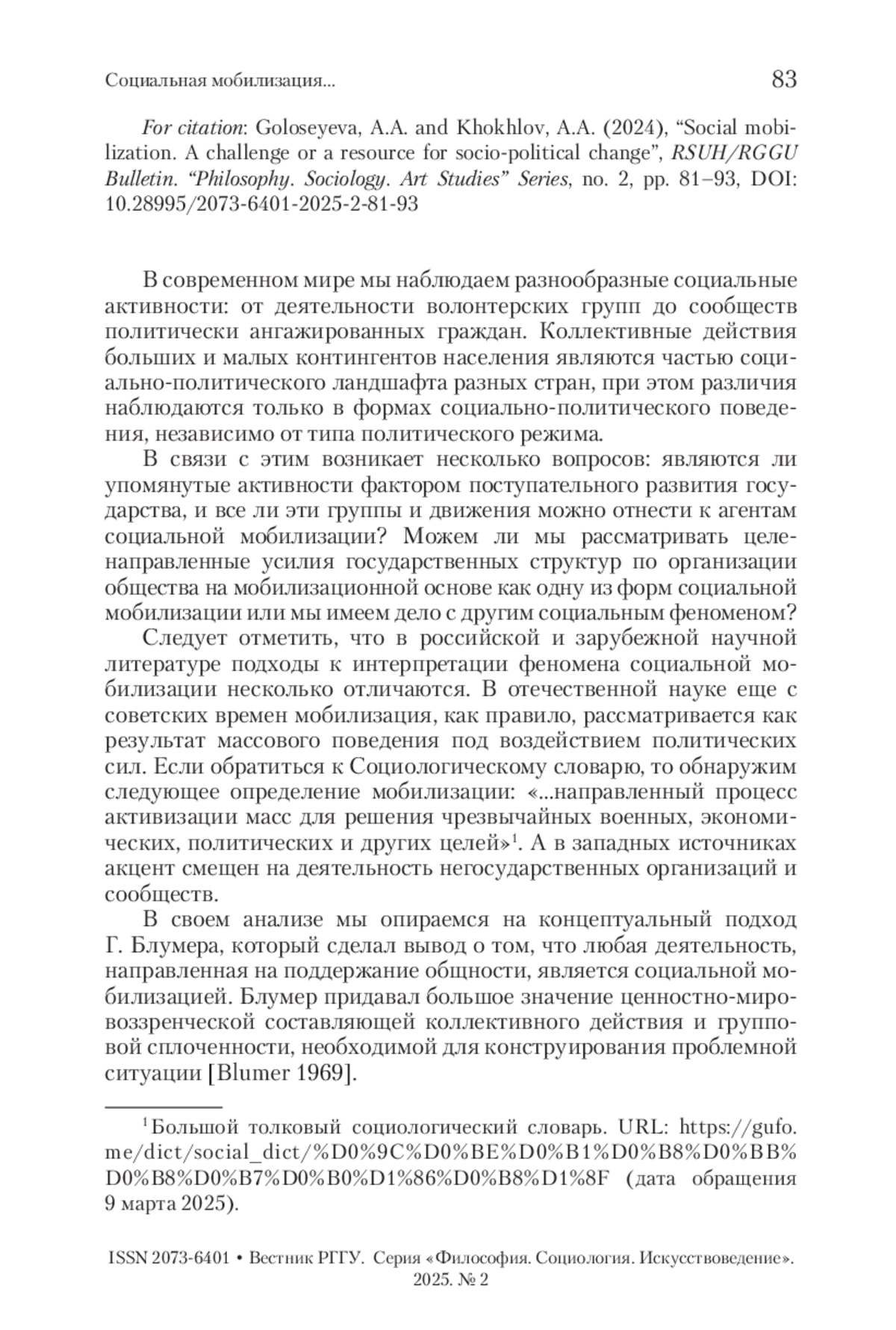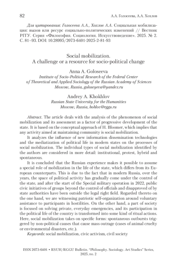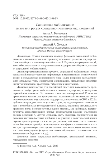 Статья посвящена анализу феномена социальной мобилизации и его оценке как фактора поступательного развития государства. За основу берется концептуальный подход Г. Блумера, подразумевающий, что любая деятельность, направленная на поддержание общности, является социальной мобилизацией. Анализируется влияние на процессы социальной мобилизации новых технологий распространения информации и медиатизации политической жизни в государствах современного типа. Более подробно рассматриваются отдельные типы социальной мобилизации, выделенные авторами: институциональная, протестная, гибридная и спонтанная. Делается вывод о том, что российский опыт дает возможность предполагать особую роль мобилизации в жизни государства, отличную от европейских аналогов. Это связано с тем, что в современной России на протяжении многих лет пространство политической активности постепенно переходило под контроль государства, а после начала СВО в 2022 г. публичные гражданские инициативы групп, не подконтрольных чиновникам и неодобряемые государственной властью, оказались вне легального правового поля. В связи с этим, с одной стороны, мы наблюдаем патриотическую самоорганизацию вокруг добровольной помощи участникам боевых действий. С другой стороны, часть общества сосредоточена на решении частных, бытовых проблем, а ее участие в политической жизни страны трансформируется в некие ритуальные действия. Здесь социальная мобилизация приобретает специфические формы: спонтанные всплески, триггерами которых выступают неполитические поводы, вызывающие массовое возмущение (случаи жестокого обращения с животными или экологические бедствия и т. д.).