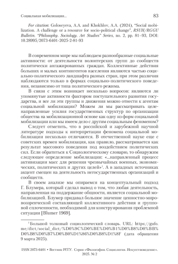 Следует отметить, что в российской и зарубежной научной литературе подходы к интерпретации феномена социальной мобилизации несколько отличаются. В отечественной науке еще с советских времен мобилизация, как правило, рассматривается как результат массового поведения под воздействием политических сил.