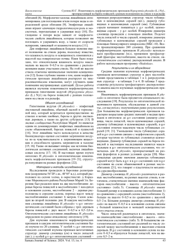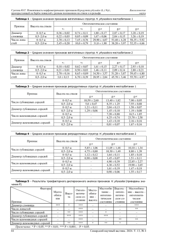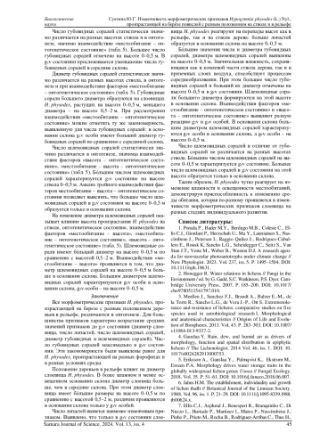 В статье рассматривается изменчивость количественных морфологических признаков эпифитного лишайника H. physodes. Исследования проведены на территории Республики Марий Эл в березняке разнотравном в основании и в середине склона, перепад высот между местообитаниями составляет 6 метров. В каждом местообитании талломы лишайника H. physodes v₁-g₃v онтогенетических состояний были собраны с деревьев березы повислой с двух высот: 0-0,5 м и 0,5-2,0 м. Изучено 6 морфометрических признаков. Сравнение признаков проведено с помощью трехфакторного (местообитание, высота на стволе, онтогенетическое состояние) дисперсионного анализа. Все морфометрические признаки различаются в онтогенезе. Разное положение деревьев в рельефе влияет только на диаметр слоевища H. physodes, наибольшие размеры характерны для более влажного и менее освещенного основания склона. Наименее изменчивый признак - число лопастей слоевища. Диаметр слоевища, число и диаметр губовидных соралей, диаметр шлемовидных соралей больше на высоте 0-0,5 м. Многие морфометрические признаки слоевища H. physodes реагируют на микроклиматические изменения в рельефе и на стволе дерева в определенных онтогенетических состояниях.