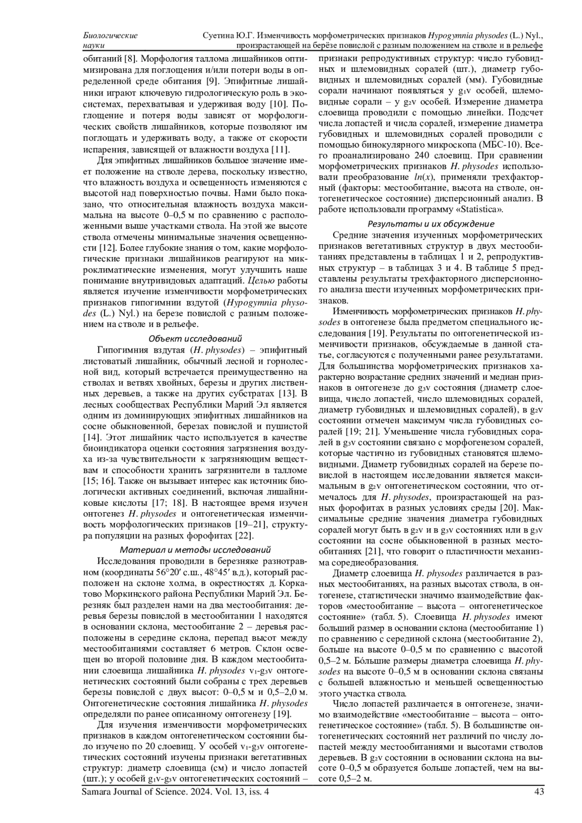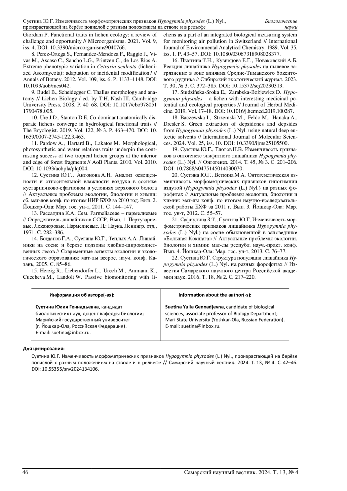 22. 	Суетина Ю.Г. Структура популяции лишайника Hypogymnia physodes (L.) Nyl. на разных форофитах // Известия Самарского научного центра Российской академии наук. 2016. Т. 18, № 2. С. 217-220. EDN: WKPIYZ