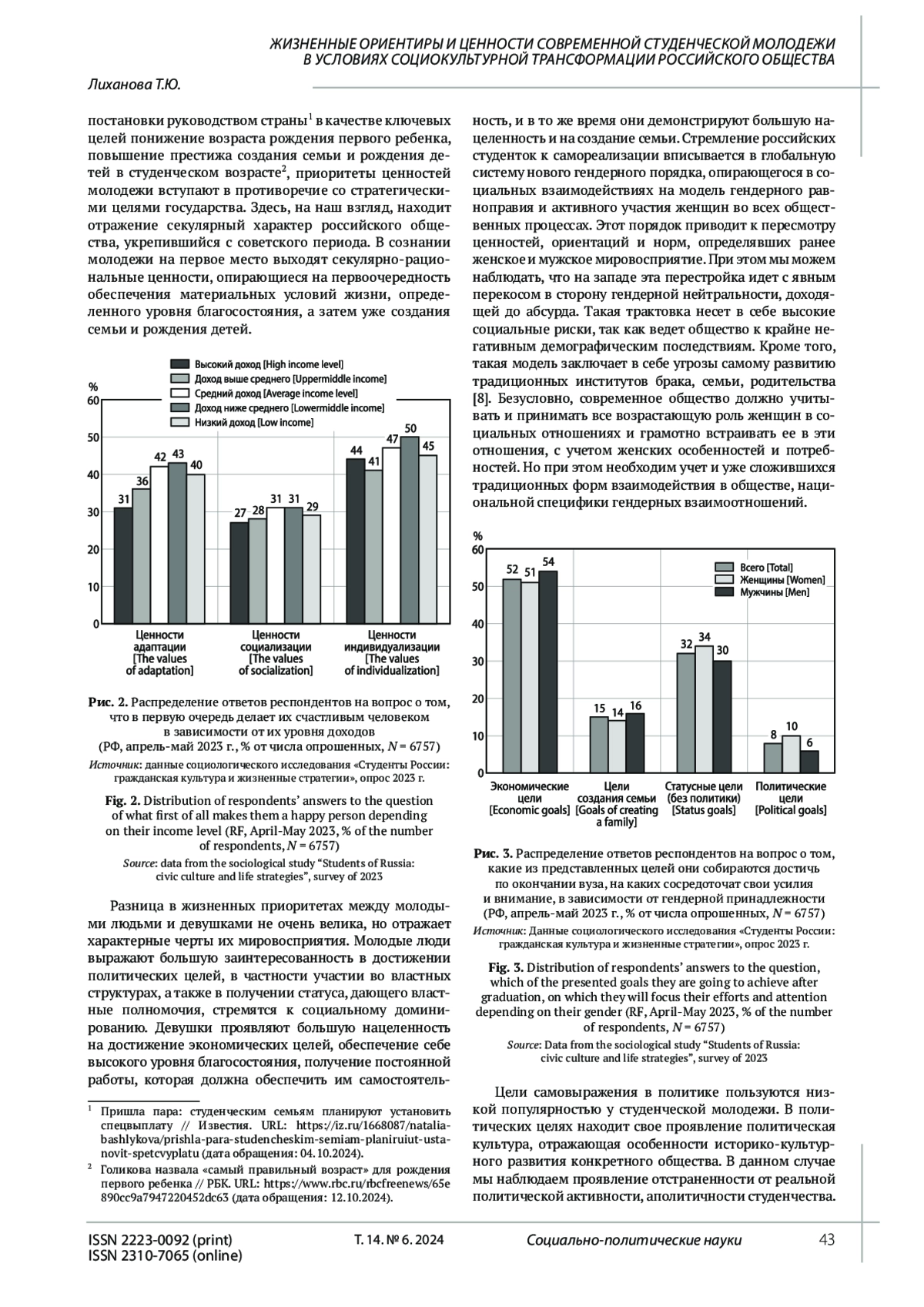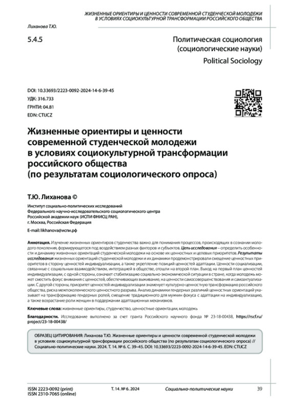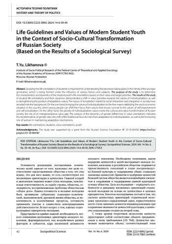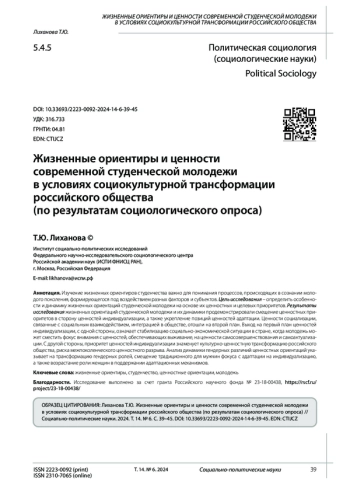 Изучение жизненных ориентиров студенчества важно для понимания процессов, происходящих в сознании молодого поколения, формирующегося под воздействием разных факторов и субъектов. Цель исследования - определить особенности и динамику жизненных ориентаций студенческой молодежи на основе их ценностных и целевых приоритетов. Результаты исследования жизненных ориентаций студенческой молодежи и их динамики продемонстрировали смещение ценностных приоритетов в сторону ценностей индивидуализации, а также укрепление позиций ценностей адаптации. Ценности социализации, связанные с социальным взаимодействием, интеграцией в обществе, отошли на второй план. Выход на первый план ценностей индивидуализации, с одной стороны, означает стабилизацию социально-экономической ситуации в стране, когда молодежь может сместить фокус внимания с ценностей, обеспечивающих выживание, на ценности самосовершенствования и самоактуализации. С другой стороны, приоритет ценностей индивидуализации знаменует культурно-ценностную трансформацию российского общества, риска межпоколенческого ценностного разрыва. Анализ динамики гендерных различий ценностных ориентаций указывает на трансформацию гендерных ролей, смещение традиционного для мужчин фокуса с адаптации на индивидуализацию, а также возрастание роли женщин в поддержании адаптационных механизмов.