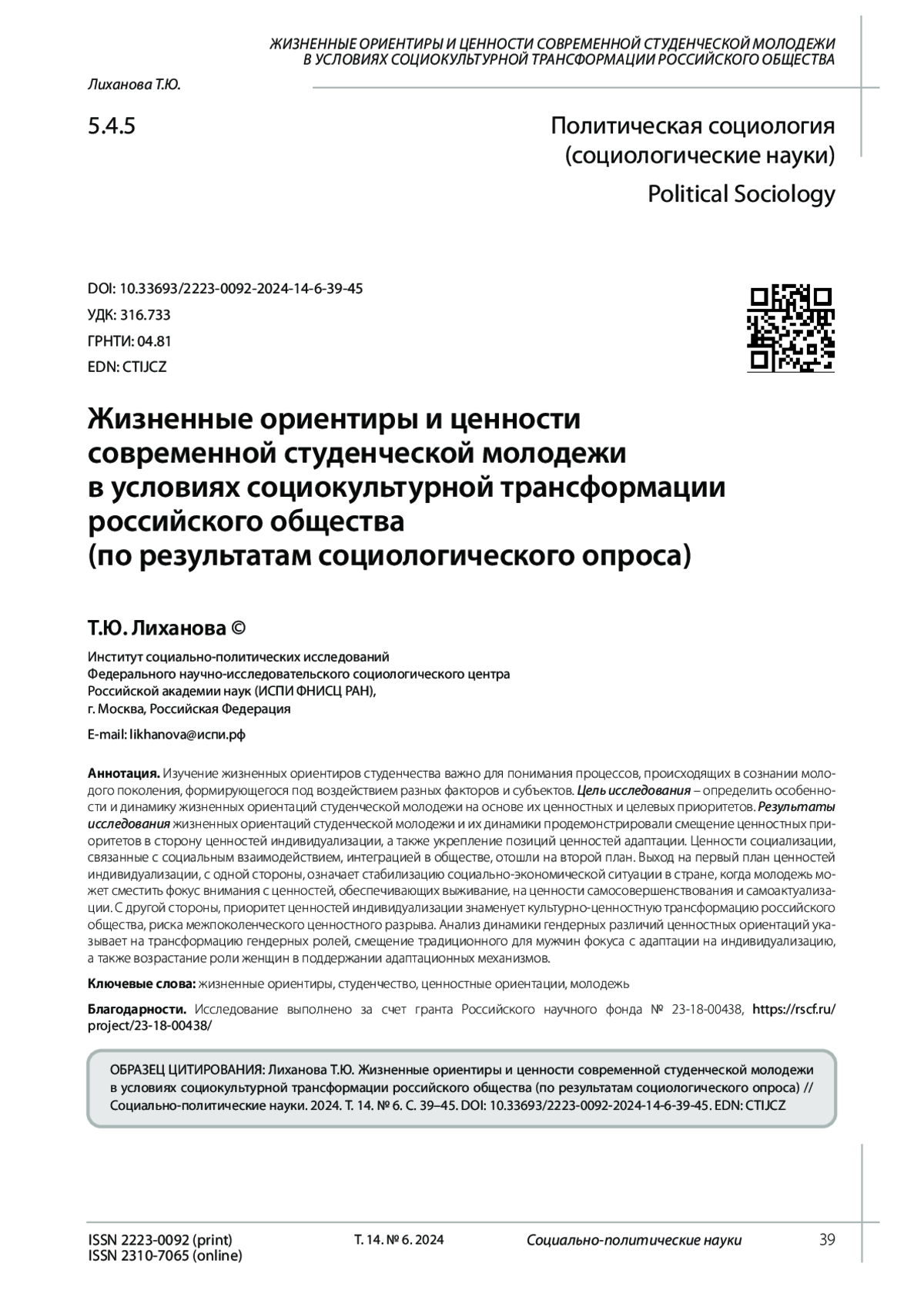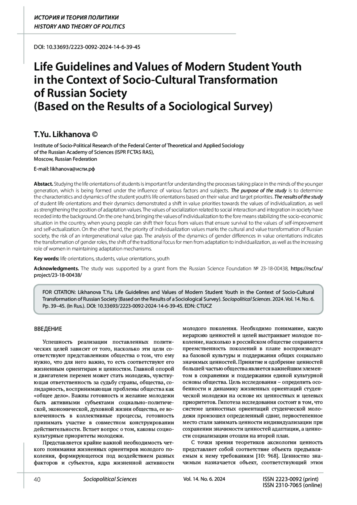 Perevezentsev S.V., Selezneva A.V., Evgenieva T.V. et al. Russian values: Traditional meanings and their reflection in the consciousness of modern youth. Collective monograph. S.V. Perevezentsev, A.V. Selezneva (eds.). Moscow: Quadriga, 2024. 720 p. ISBN: 978-5-91791-519-7