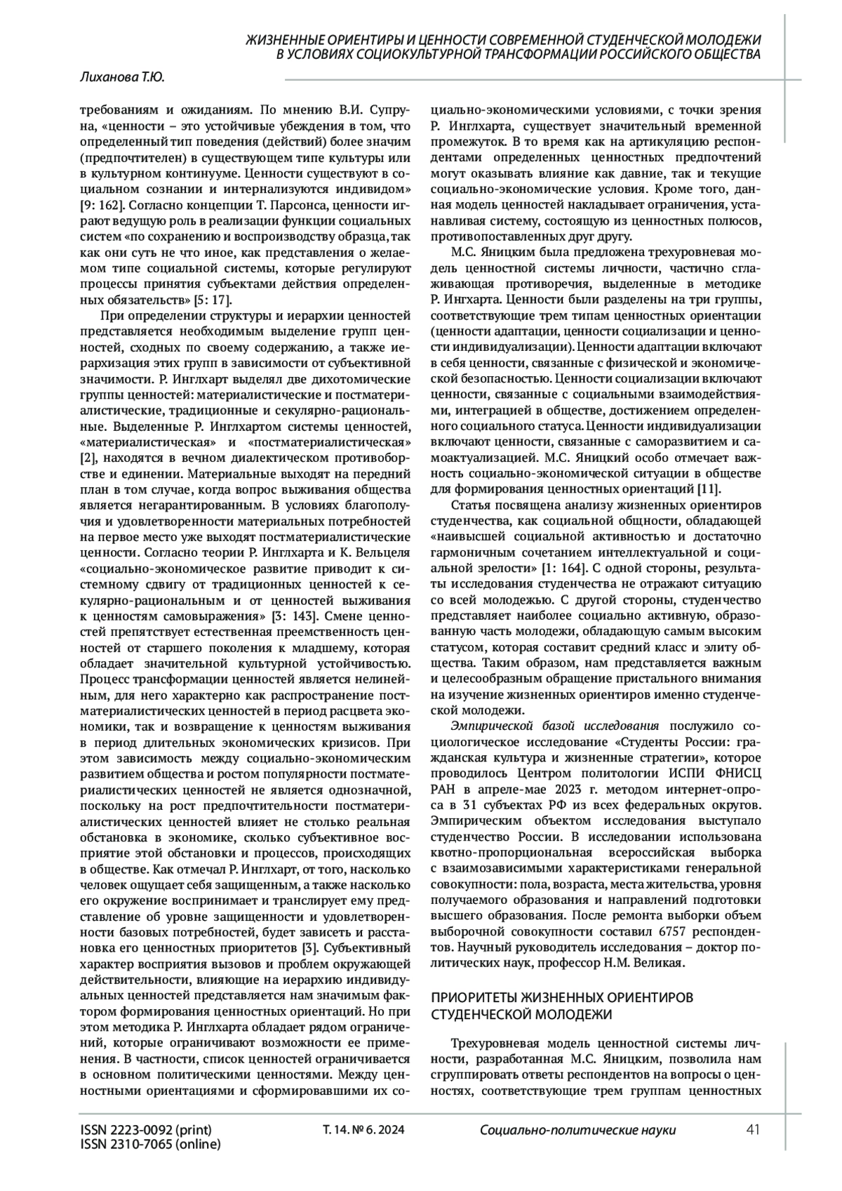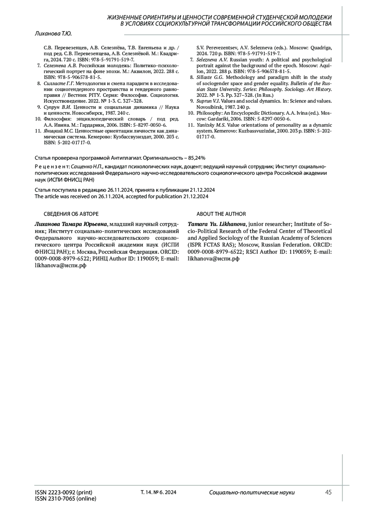 6. 	Русские ценности: Традиционные смыслы и их отражение в сознании современной молодежи: кол. монография / С.В. Перевезенцев, А.В. Селезнёва, Т.В. Евгеньева и др. / под ред. С.В. Перевезенцева, А.В. Селезнёвой. М.: Квадрига, 2024. 720 c. ISBN: 978-5-91791-519-7 EDN: EZNVJQ